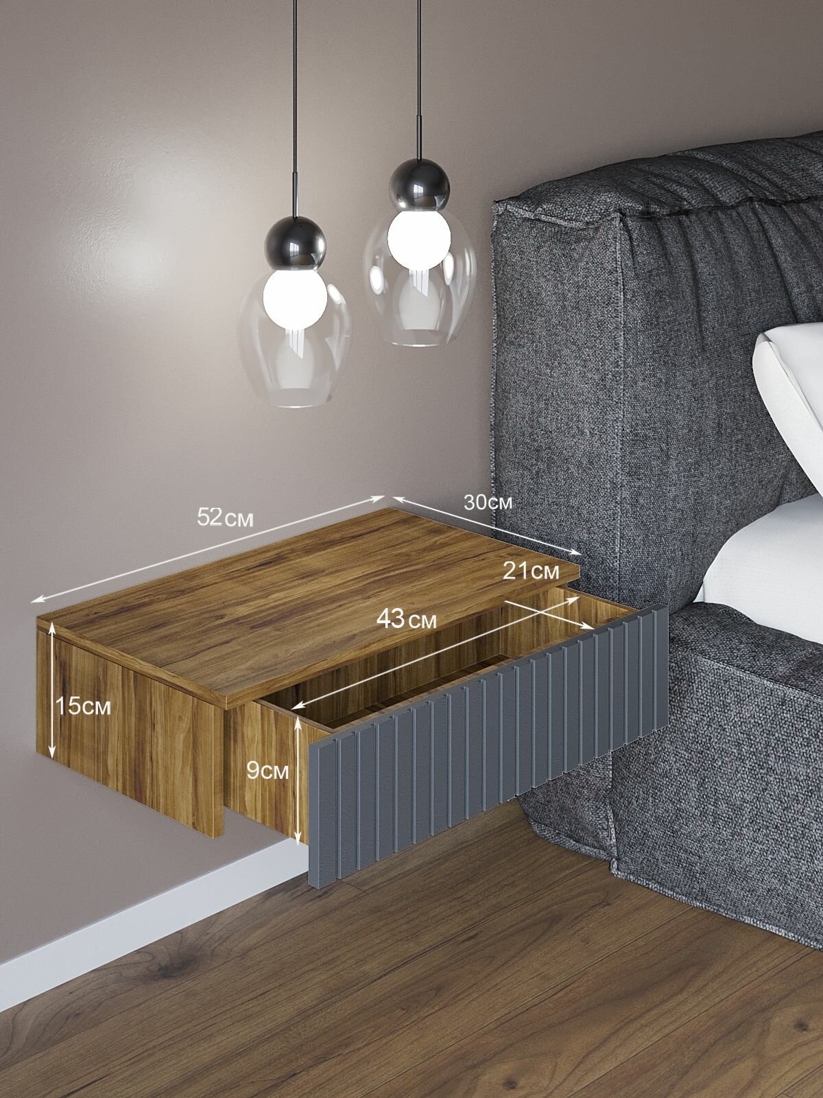 Тумба прикроватная подвесная Стелла, 52см х 30см х15см, Вотан/Графит