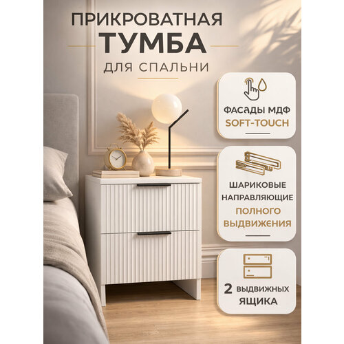 Эта современная прикроватная тумба с ящиками сочетает в себе лаконичный дизайн и продуманную эргономику. Матовый белый фасад из МДФ с фрезеровкой эффектно дополняют черные металлические ручки.