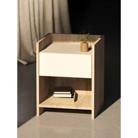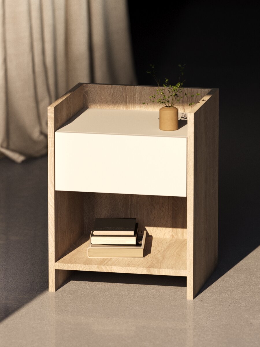 Тумба прикроватная - простая и функциональная прекрасно подойдет под любой интерьер. Тумба выполнена из ЛДСП 1 сорта класса Е1, оснащена выдвижным ящиком на бесшумных шариковых направляющих, в котором вы можете хранить любые необходимые мелочи. У тумбы отсутствует лицевая фурнитура, открытие за низ фасада ящика. В комплекте идет фурнитура для монтажа и инструкция по сборке.