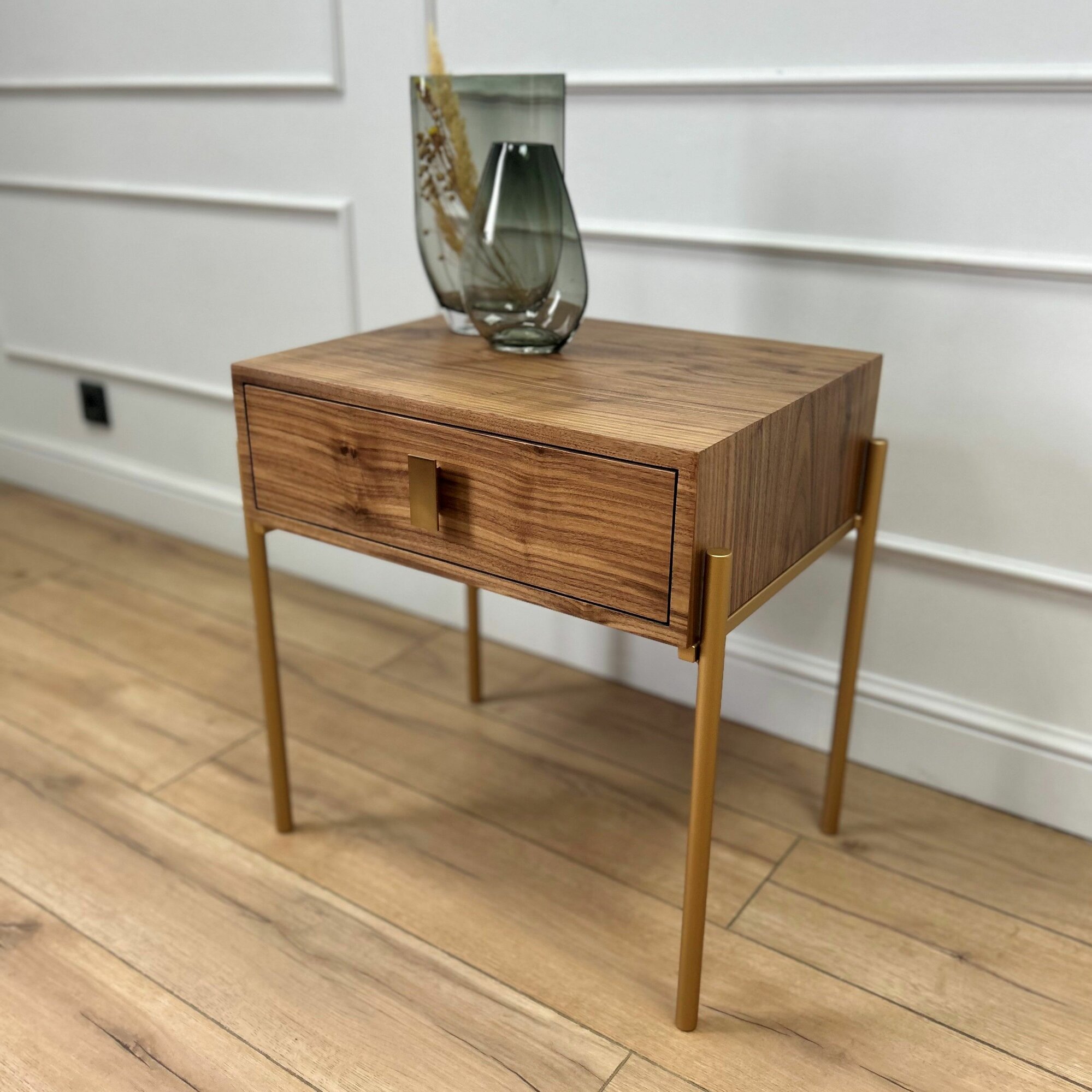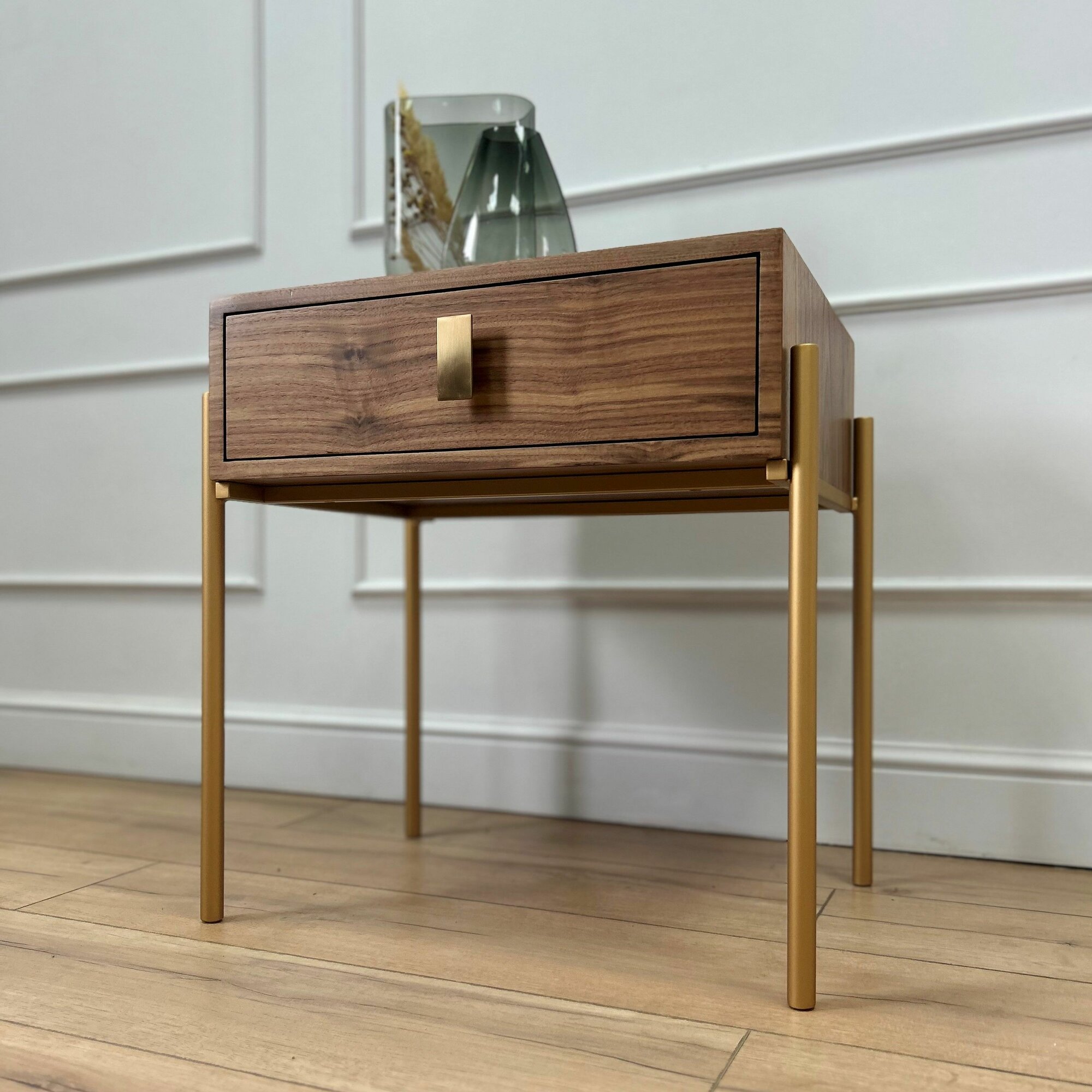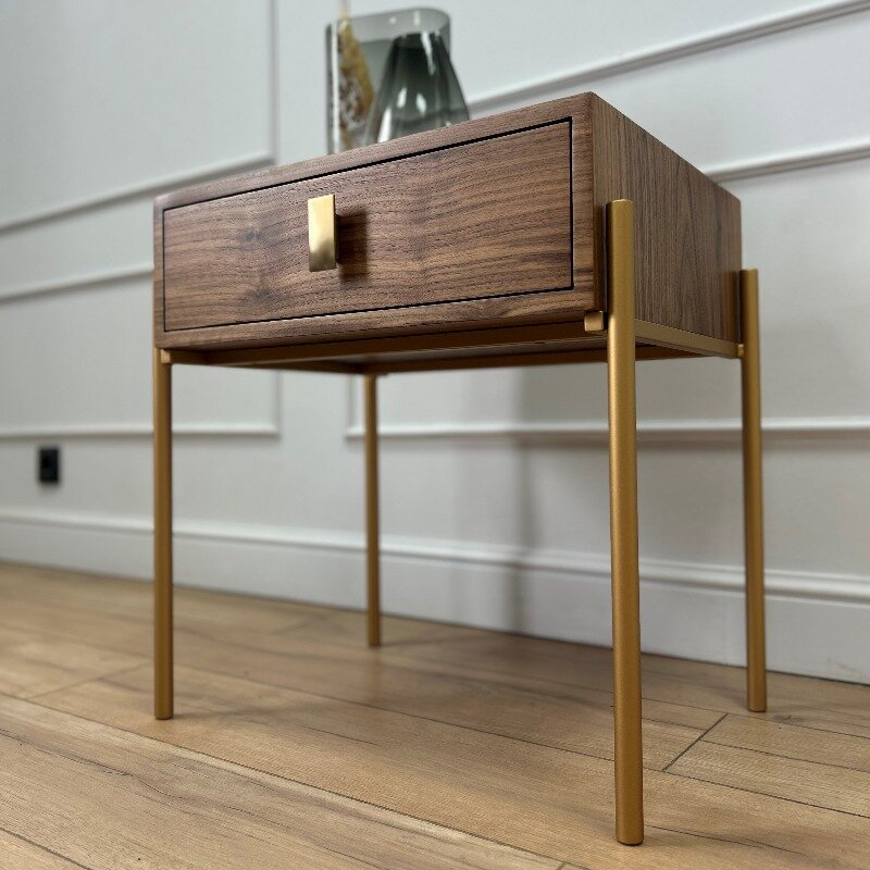 Изготовленная из натурального шпона орех американский, маленькая тумба прикроватная выглядит стильно и служит надежной основой для хранения. Корпус и фасад тумбы покрыты ультра-матовым лаком, который сохраняет тактильные и визуальные свойства благородного дерева. Его структура и оттенки подчеркивают сдержанную роскошь, идеально вписываясь в интерьеры в стиле минимализм, сканди и лофт. Металлические ножки стальные в покраске золотистого цвета и регулируемыми подпятниками гарантируют стабильность и легкость использования тумбы даже на неровном полу. Ящик, оснащенный скрытыми направляющими с доводчиками, закрывается плавно и бесшумно, а металлическая ручка обеспечивает комфортное использование. Это идеальное решение для хранения книг, косметики или других личных вещей, которые важно иметь под рукой, но не на виду. Компактные размеры делают эту тумбу на ножках идеальным вариантом для небольших помещений, таких как коридор или детская мебель.