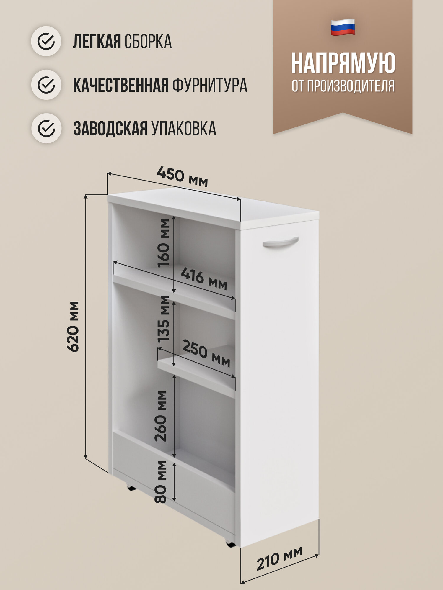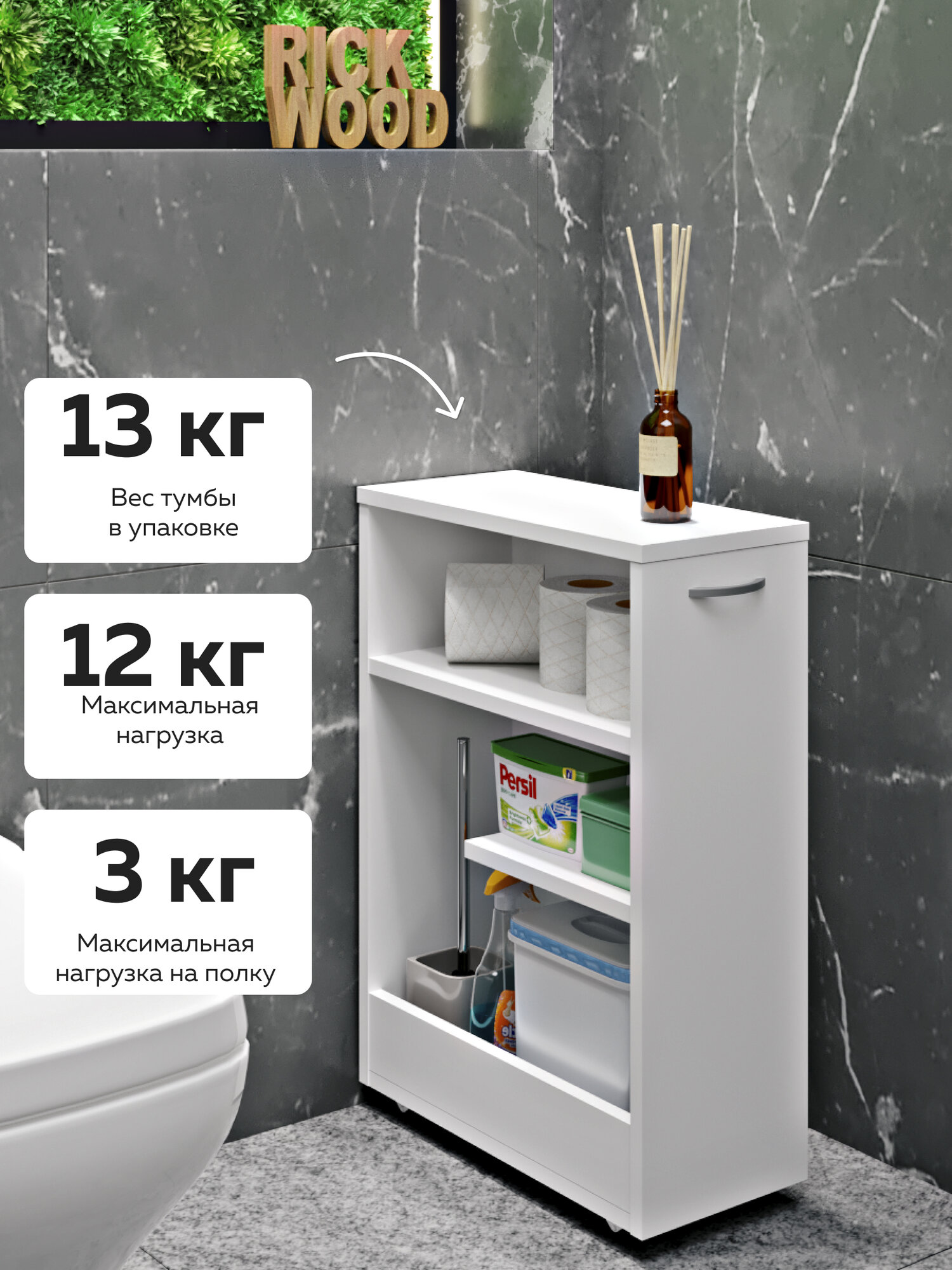 Напольная мебель всегда востребована в любом помещении. Представляем узкую тумбу на колесиках - отличный выбор для вашего дома. Эта универсальная тумбочка идеально подойдет для разных целей. Узкая тумба с полками - практичное решение для вашей ванной комнаты. В ней вы сможете хранить различные мелочи и аксессуары, не занимая лишнего места. Также эта тумбочка на колесах будет отлично смотреться рядом с душевой кабиной. Удобные ящики помогут организовать пространство, а колесики обеспечат легкость перемещения по желаемому месту. Деревянная тумба выглядит стильно и элегантно, что добавляет шарма вашему интерьеру. Этажерка оборудована ящиками и полками, что делает ее отличным органайзером для разных вещей. Независимо от того, используете ли тумбу напольную, как стол для раковины в ванной комнате или как организатор для хранения одежды в прихожей — практичность этой тумбы не вызывает сомнений. Итак, если вы ищете функциональную мебель для разных целей — от хранения бытовой химии до организации косметики — этот мини шкаф станет вашим верным помощником. Шкаф на пол с ящиками - отличное решение для хранения одежды и различных предметов. Узкая напольная тумба может служить не только функционально, но и декоративно. Организуйте стильно пространство в туалетной комнате с помощью тумбы белой от Rick Wood. Ванная комната требует особого подхода к организации вещей , поэтому узкая тумба будет настоящим спасением для этого помещения. Изготовлен шкаф для ванны из ЛДСП 16 мм - надежного и долговечного материала, обеспечивающего безопасность использования, обеспечивая комфорт эксплуатации. Белый матовый цвет изделия не оставляет отпечатки пальцев, что удобно в процессе использования. Максимальная нагрузка на тумбу 13 кг, на полку до 3 кг. Мы создали понятную инструкцию, чтобы сборка тумбы для ванной не заняла много времени , а качественная упаковка сохранила все ценные детали до самого последнего монтажного шага. Выбрав такую функциональную и стильную мебельную деталь как "тумбочка с полками", вы делаете правильный выбор в пользу комфорта и функциональности своего жилища! Маленькая тумбочка станет отличным выбором для организации рабочего пространства или как опора для нужных предметов. Напольный шкаф с ящиками порадует своим функционалом - он способен вместить все необходимое, сохранить порядок и освободить поверхность от лишних предметов. При этом его изящный дизайн позволяет удачно дополнить интерьер. Позвольте себе упростить повседневные заботы с помощью этой универсальной узкой тумбы на колесиках!