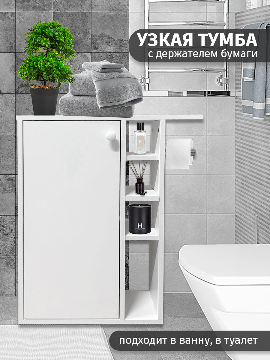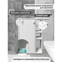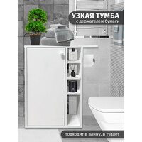 Шкаф в ванную напольный идеальное хранение в ванной комнате поможет вам эффективно использовать каждый сантиметр площади, а его напольная конструкция гарантирует надежность и устойчивость. Стеллаж из гладкого белого ЛДСП. Тумба с держателем туалетной бумаги станет отличным дополнением, позволяя хранить в ней все необходимое — от косметических средств до бытовых принадлежностей.