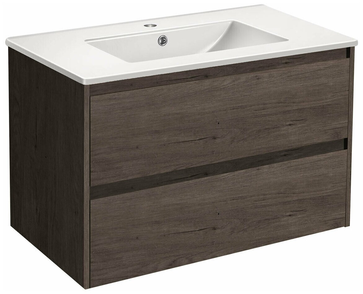 Тумба подвесная в комплекте с керамической раковиной. Материал корпуса и фасада - влагостойкий ЛДСП. Имеются 2 выкатных ящика с доводчиками, Soft Close Сифон в комплект не входит, но подойдет любой стандартного диаметра и производителя.