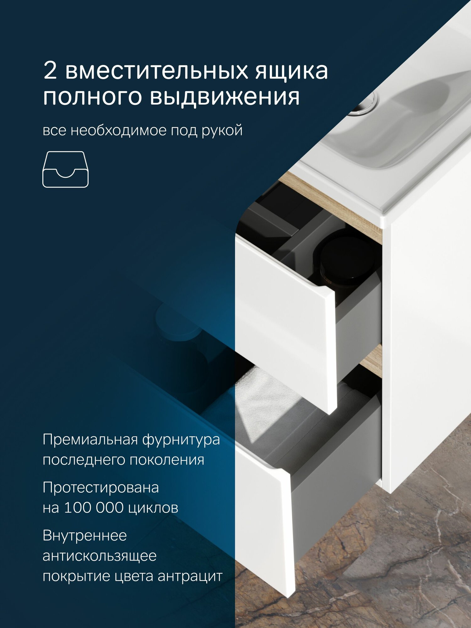- Функциональный органайзер в первом ящике — косметика, щётки, аксессуары — всё на своих местах