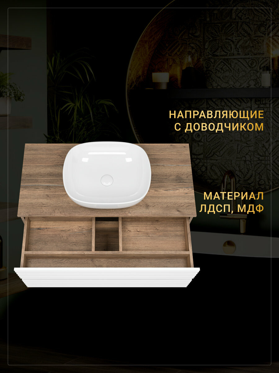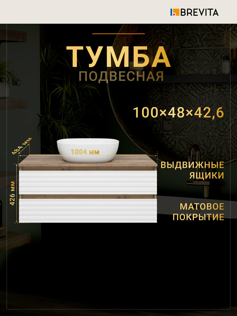 BREVITA – это мебель для ванной комнаты премиального сегмента. Использование современных дорогих материалов обеспечивает не только высокое качество и долговечность продукции, но и создает эффектный внешний вид. При изготовлении мебели используется натуральная древесина и искусственный камень, латунь и МДФ с многослойным эмалированным покрытием. Продуманная до мелочей конструкция гарантирует не только удобство в эксплуатации и высокую надежность, но и обеспечит рациональное использование пространства. Бренд BREVITA представлен различными коллекциями мебели для ванной, выполненных в разных стилях – от классики и модерна, до авангарда и лофт. Это позволит подобрать комплект, который идеально впишется в любой интерьер. Позвольте себе новый уровень комфорта и качества с мебелью BREVITA! Предлагаем Вашему вниманию Тумба под раковину Brevita Dakota - 100 подвесная (белая). Габариты (ШГВ), см: 100x43x48. Материал: ЛДСП; МДФ. Расположение: Настенная. Система хранения: С ящиками. Раковина приобретается отдельно. (Подходит раковина Melana MLN-A419 - 50)