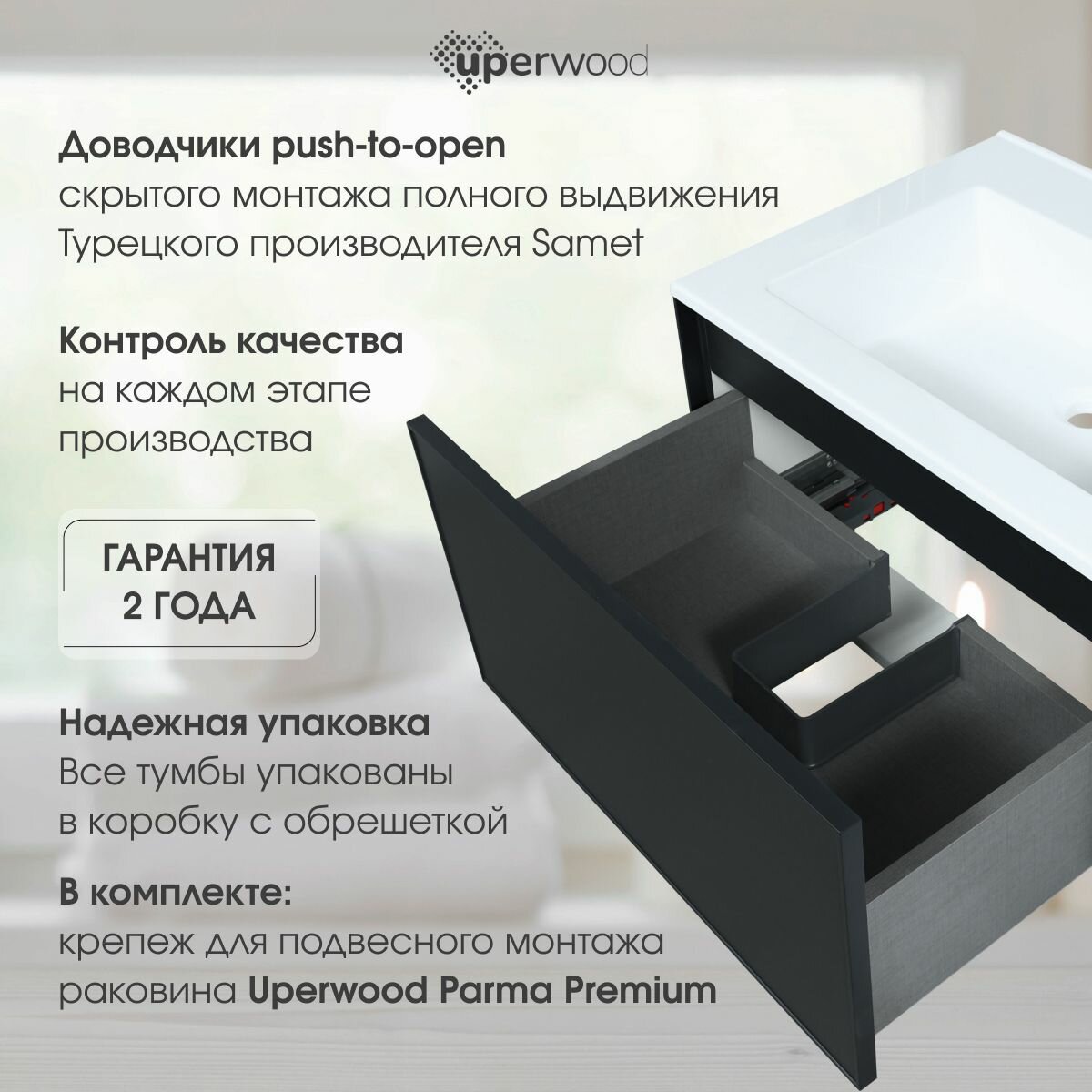 Тумба для ванной комнаты Uperwood Parma Premium выполнена из влагостойкого МДФ повышенной плотности, класса МВ: толщина фасада 19 мм, толщина боковин 16 мм. Выдвижной ящик изготовлен из влагостойкой ЛДСП. МДФ и влдсп производство Egger (Австрия). Ящик оснащен доводчиками Samet (Турция), пуш скрытого монтажа полного выдвижения.