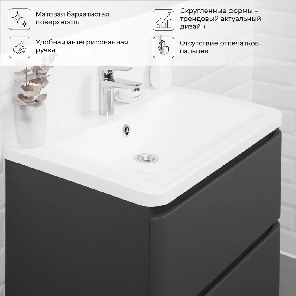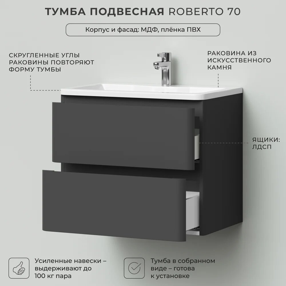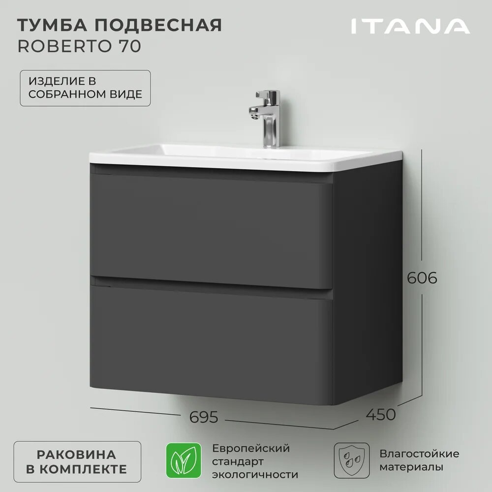 Купить Тумба с раковиной Itana Roberto 70 подвесная, 69, 6 см, черная, с ящиками, прямоугольная, в современном стиле из МДФ из камня серая с доставкой по всей России. Тумба с раковиной Itana Roberto 70 подвесная, 69, 6 см, черная, с ящиками, прямоугольная, в современном стиле из МДФ из камня серая: сравнение цен, характеристики, фото, актуальное наличие и цены.