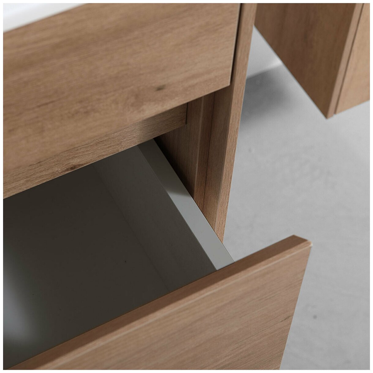 Тумба подвесная в комплекте с раковиной из кварца серого цвета. Материал корпуса и фасада - влагостойкий ЛДСП. Имеется 1 выкатной ящик с доводчиками, Soft Close Сифон в комплект не входит, но подойдет любой стандартного диаметра и производителя.