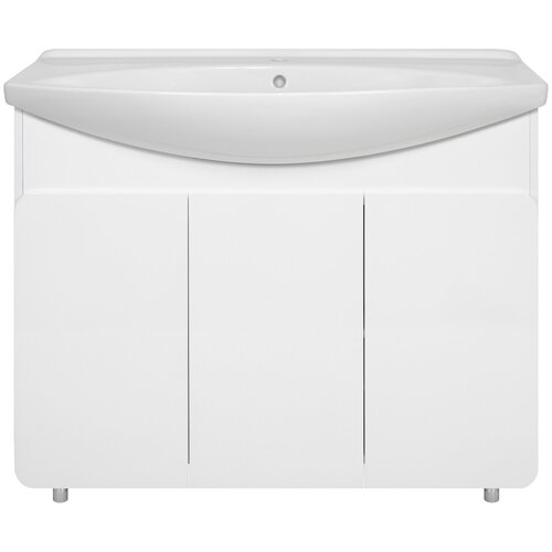 Тип: тумба с раковиной Ширина, см: 105,5 Глубина, см: 47,5 Высота, см: 90 Область применения: бытовая Стилистика дизайна: современный стиль Форма мебели: прямоугольная Цвет: белый Страна: Россия Монтаж: напольный Оснащение: петли с доводчиком, подвесы 2 шт, шуруп с Г-образным крючком 2 шт. Ориентация: универсальная Материал корпуса: ЛДСП Покрытие корпуса: эмаль, глянцевое Материал фасада: МДФ Покрытие фасада: эмаль, глянцевое Система хранения: с дверками, с полками Материал раковины: фаянс Форма раковины: полукруглая Цвет раковины: белый