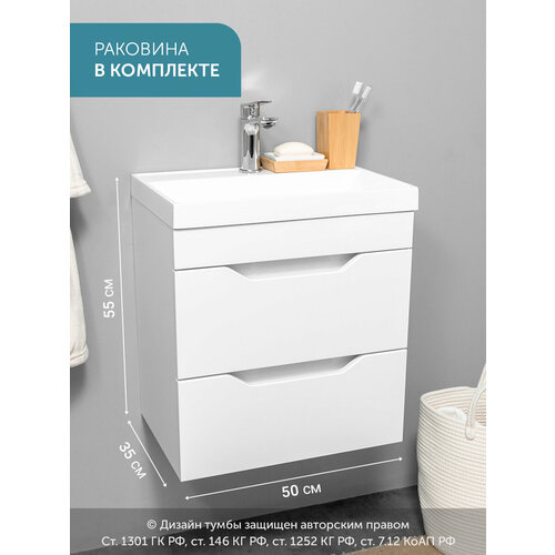 Купить Тумба с раковиной в ванную Arona 50, умывальник в комплекте, белая с ящиками с доставкой по всей России.