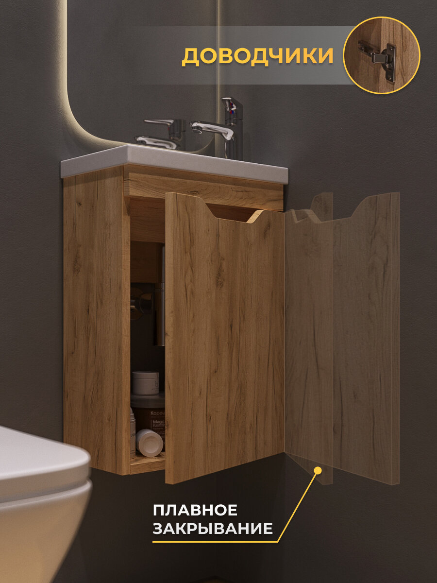 Тумба с раковиной IZEO 40 - это стильное и функциональное решение для вашей ванной комнаты. Изготовленная из высококачественного ЛДСП, она обеспечивает прочность и долговечность. Цвет дуб крафт золотой придает тумбе изысканный и современный вид.