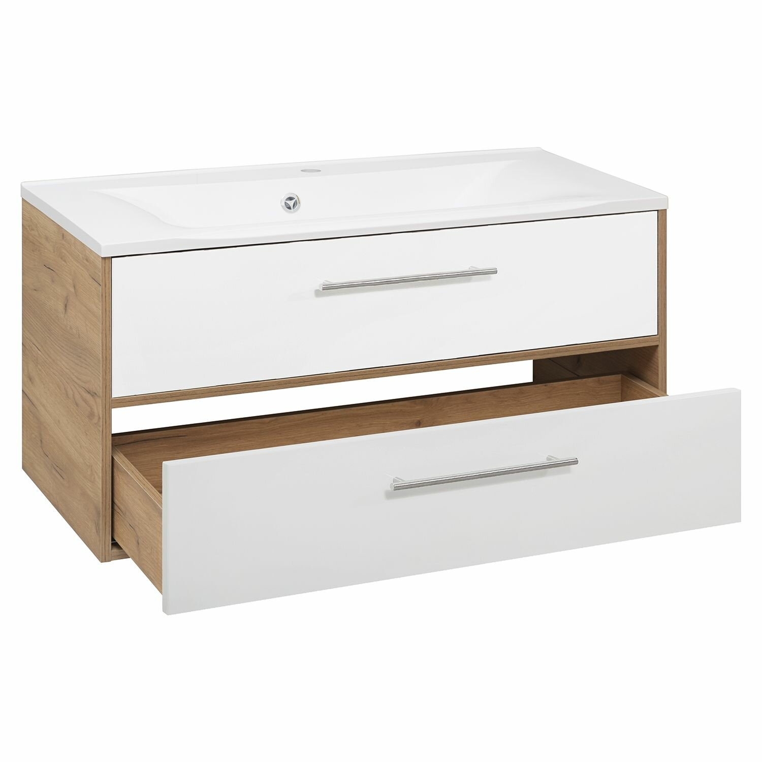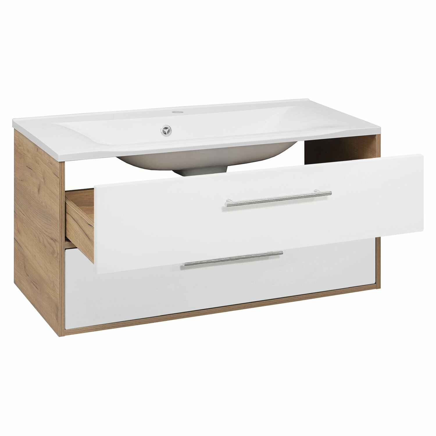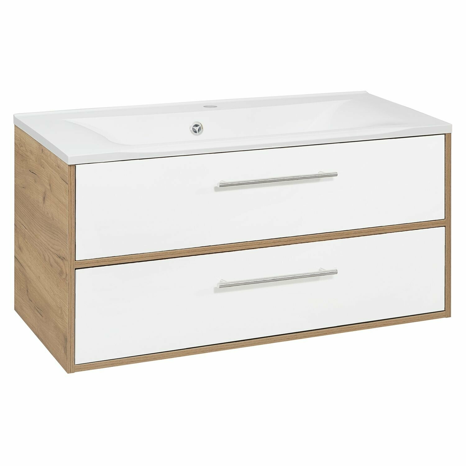 Тумба MELBOURNE 100 см — это стильное и функциональное решение для современной ванной комнаты. Ее минималистичный дизайн, удобная конструкция и сочетание материалов делают эту модель универсальной и элегантной. Тумба подвесная MELBOURNE 100 см дуб/белый выполнена в изящном сочетании древесной текстуры и белых глянцевых фасадов, подчеркивая стиль и утонченность интерьера.