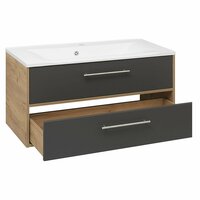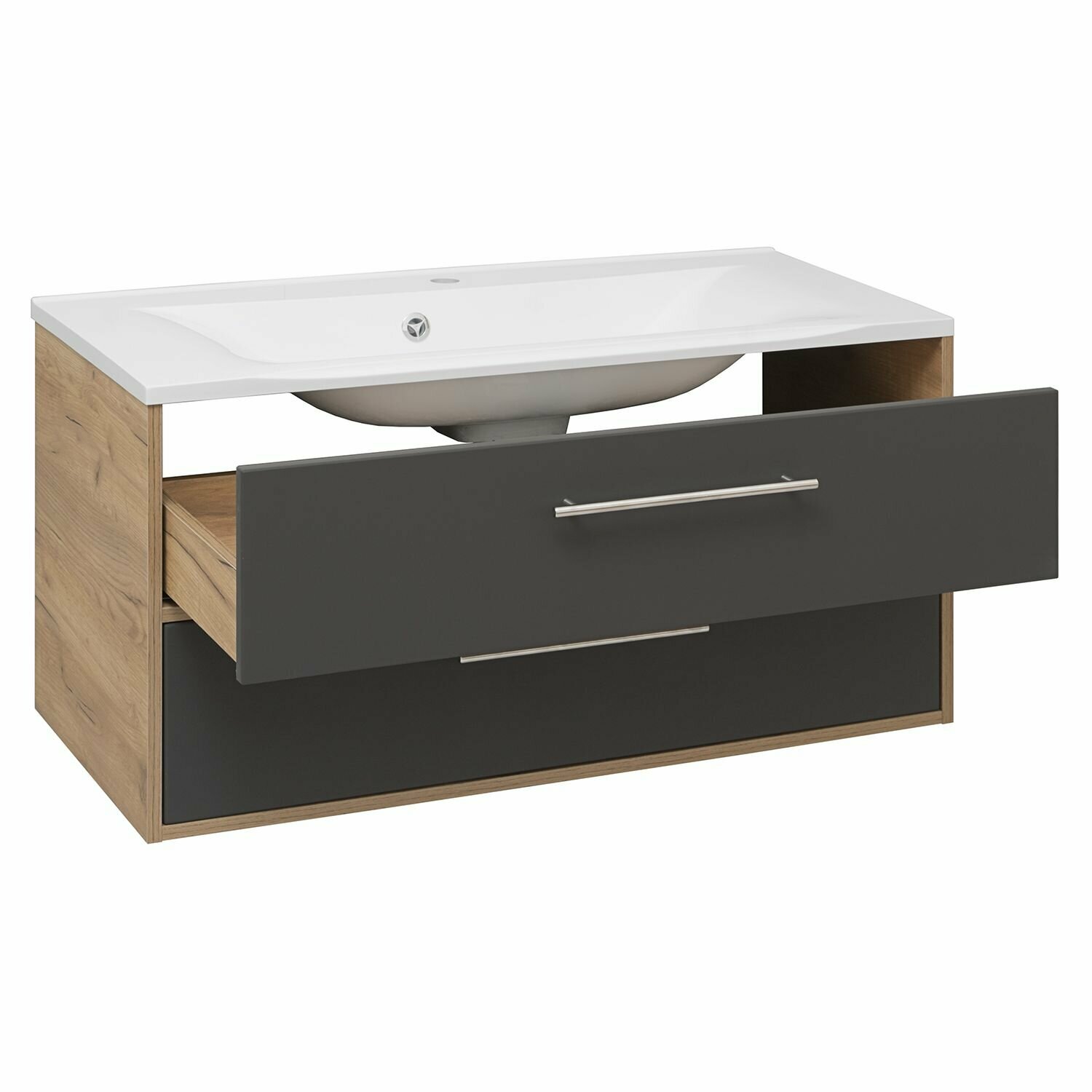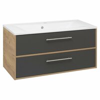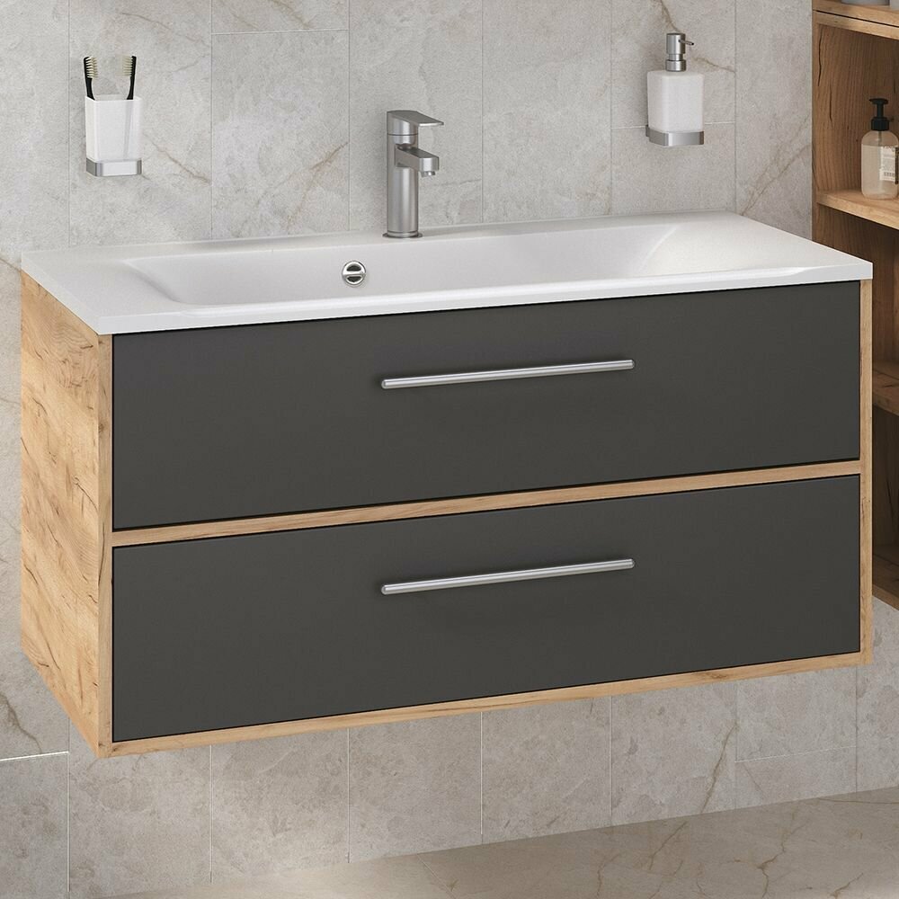 Тумба MELBOURNE 100 см — это стильное и функциональное решение для современной ванной комнаты. Ее минималистичный дизайн, удобная конструкция и сочетание материалов делают эту модель универсальной и элегантной. Совершенный баланс стиля и практичности. Тумба подвесная MELBOURNE 100 см дуб/серый выполнена в изящном сочетании древесной текстуры и темно-серых матовых фасадов, подчеркивая стиль и утонченность интерьера.