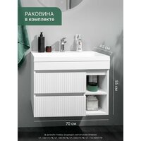 Тумба с умывальником имеет несколько ящиков и ниш, которые идеально подходят для хранения гигиенических принадлежностей, полотенец и других необходимых аксессуаров. Благодаря своим компактным размерам и тому, что она подвешена, она позволяет создавать визуально легкое пространство, что особенно важно в небольших ванных комнатах.