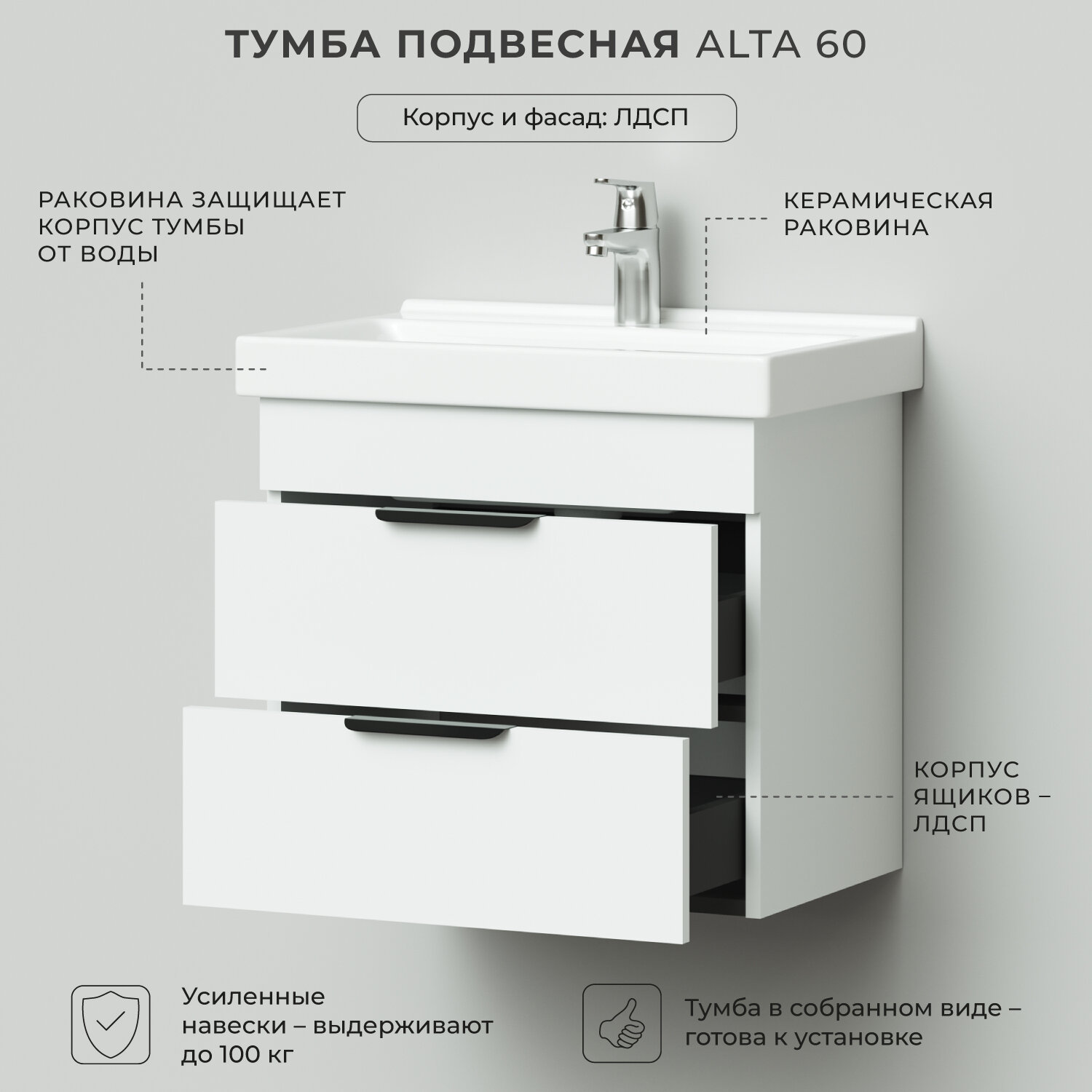Подвесная тумба с раковиной из коллекции Alta - это сочетание природного декора и благородства металла. Современные материалы из которых изготовлена тумба для ванной, обладают повышенной влагостойкостью. Материал корпуса и фасадов тумбы для ванной из ламинированного ДСП. Качественная фурнитура с доводчиками обеспечивает легкое открывание и плавное закрывание ящиков и дверок. Вырез под сифон универсальный, для любого типа. Благодаря своей конструкции тумба обеспечивает удобный доступ к раковине и позволяет скрыть коммуникации. Тумба с раковиной в ванную оснащена удобными ящиками для хранения, что позволяет разместить всё необходимое под рукой. Керамический умывальник – это безупречная гладкость поверхности, на которой не задерживаются загрязнения. Легкий уход, что обеспечивает гигиеничность. А так же долговечность – ударопрочность, устойчивость к царапинам и химическим веществам. Дополнить комплект можно зеркальным шкафом, пеналом или стеллажом. Для точного выбора тумбочки с раковиной в ванную комнату рекомендуем обратиться к схеме замеров, которая находится на фото в карточке товара, размеры изделия могут отличаться +/-1 см в связи со спецификой производства. Тумба для ванной доставляется в предварительно собранном виде, надежно упакована. Изделия коллекции качественные, функциональные и органически впишутся в популярные и современные интерьерные решения для ванных комнат.