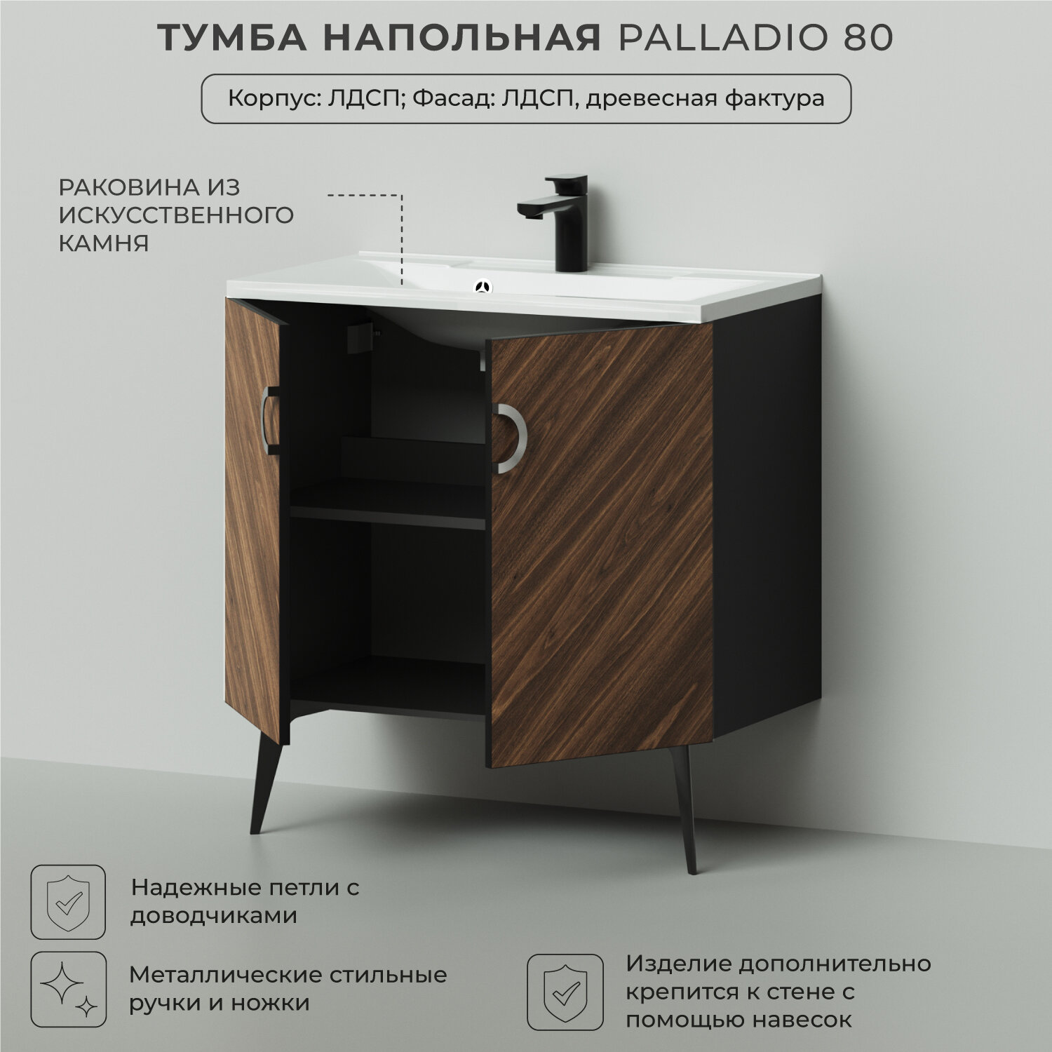 Коллекция Palladio - великолепное звучание современной классики. Изящные пропорции и нестандартный подход к дизайну с сохранением функциональности. Тумба с раковиной выполнена из ЛДСП в модных деревянных декорах. Технология производства позволила сделать элементы мебели устойчивыми к влаге. Качественная фурнитура с доводчиками обеспечивает легкое открывание и плавное закрывание дверей. Дизайнерские металлические ручки с покрытием - не только декоративный элемент, но и удобное решение - фасады остаются чистыми при постоянном открывании и закрывании. Вырез под сифон универсальный, для любого типа. Благодаря своей конструкции тумба обеспечивает удобный доступ к раковине и позволяет скрыть коммуникации. Тумба с раковиной в ванную оснащена удобным шкафчиком для хранения, что позволяет разместить всё необходимое под рукой. Для точного выбора тумбочки с раковиной в ванную комнату рекомендуем обратиться к схеме замеров, которая находится на фото в карточке товара, размеры изделия могут отличаться +/-1 см в связи со спецификой производства.