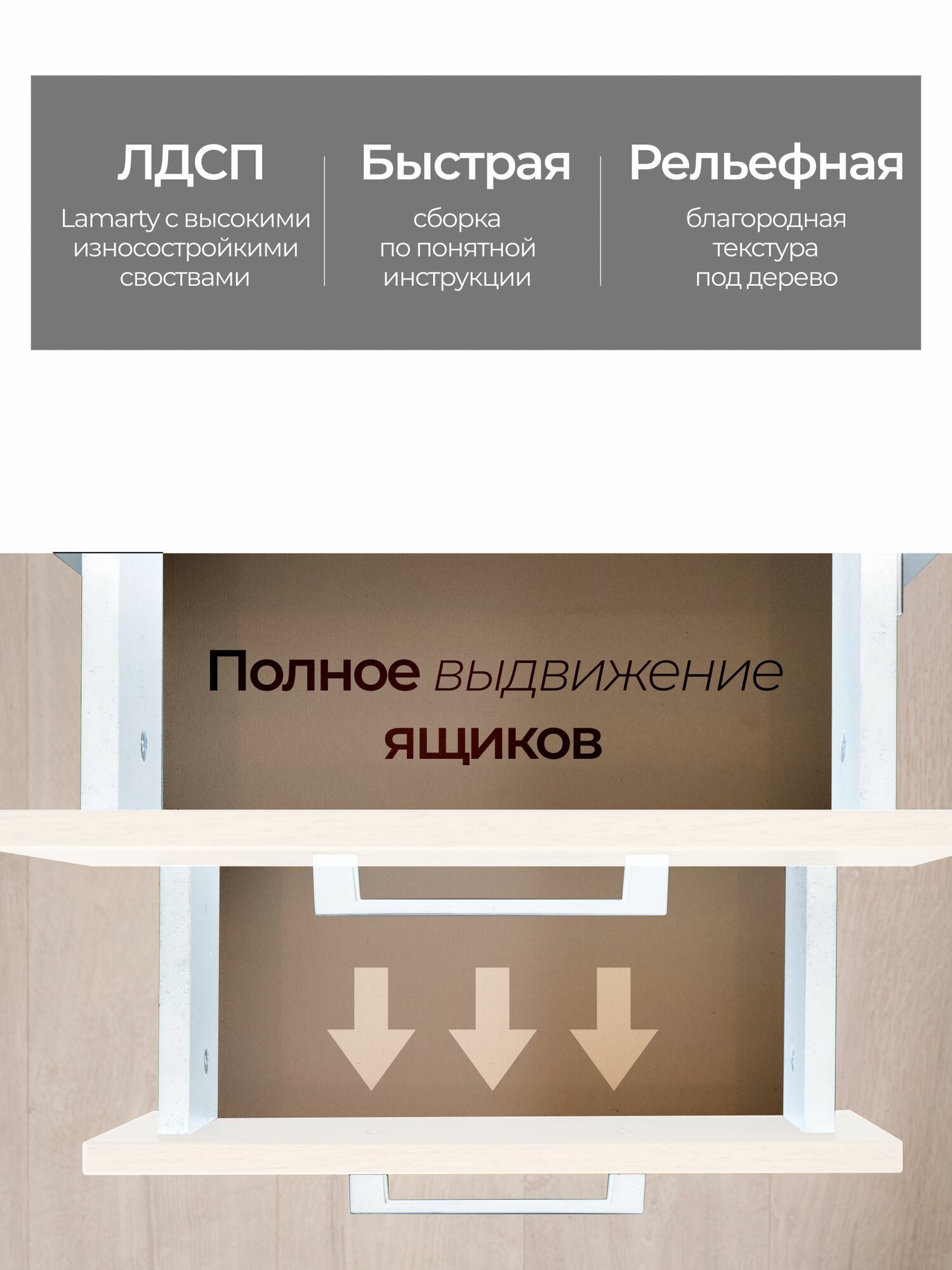 Тумба изготовлена из качественного ЛДСП, что гарантирует прочность и долговечность изделия. Ламинированное покрытие корпуса и фасада защищает мебель от воздействия влаги и пыли, а также облегчает уход за мебелью.