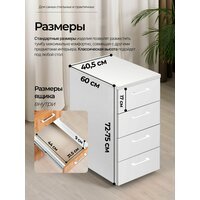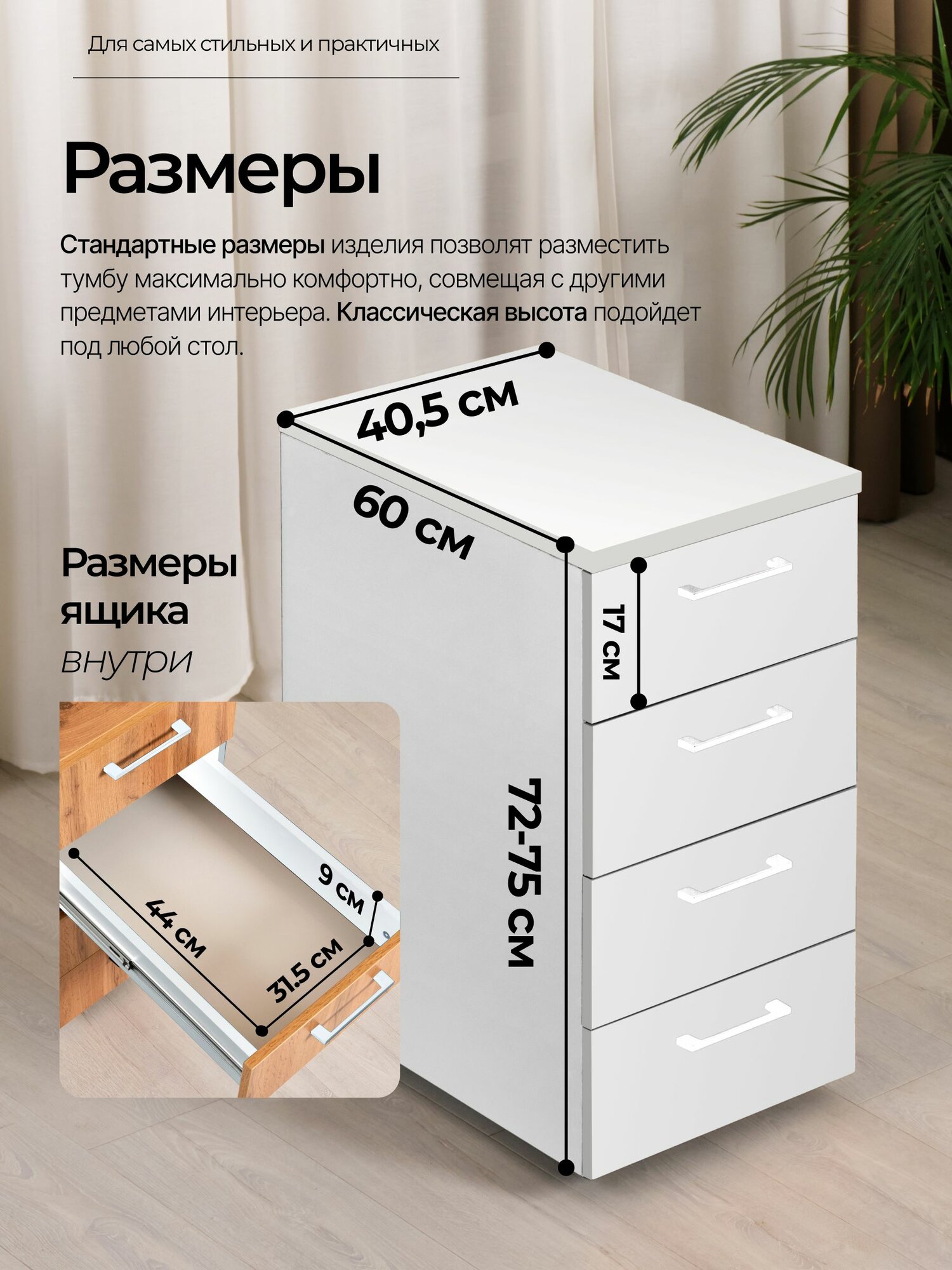 Тумба оснащена четырьмя ящиками, что обеспечивает удобное хранение документов, книг и других предметов. Шариковые направляющие обеспечивают плавное и бесшумное выдвижение ящиков.