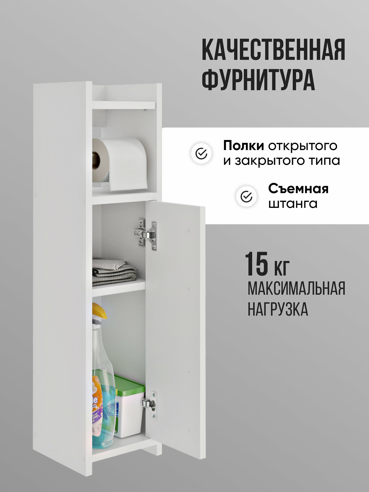 Изысканное решение для вашей спальни - узкая тумба, которая станет незаменимым аксессуаром в вашем интерьере. Эта прикроватная тумба обладает всеми преимуществами, которые вы ищете в качественной мебели. Изготовлена из высококачественного ЛДСП толщиной 16 мм, эта тумба не только элегантна и стильна, но также и прочна. Благодаря этой особенности она легко справится с любыми повседневными задачами и сохранит свою привлекательность на долгие годы. Уникальная особенность прикроватной тумбы заключается в ее съемной штанге. Она позволяет вам регулировать высоту полки по вашему желанию и предоставляет дополнительные возможности для хранения разнообразных предметов: от книг до аксессуаров. Независимо от размеров вашей спальни, эта узкая тумба подходит для любого помещения. Она может быть установлена как напольно, так и настенно или навесно - выбор за вами! Ее компактные размеры и функциональность делают ее идеальным решением для самых различных помещений, будь то спальня, ванная комната или прихожая. В комплекте с тумбой вы получите полный набор крепежей и необходимую фурнитуру для сборки. Инструкция по сборке прилагается, что позволит вам быстро и легко создать уникальное пространство в вашей спальне. Не смотря на свою небольшую ширину, эта тумба обладает высокой надежностью и максимальной нагрузкой до 15 кг. Она предлагает достаточно места для хранения всех нужных вам вещей на прикроватном столике - от книг и газет до очков и зарядных устройств для электроники. Так что, если вы ищете стильную и практичную тумбу прикроватную для своей спальни, то эта узкая модель подходит как нельзя лучше! Приобретайте эту тумбу прямо сейчас, чтобы дополнить свою спальню изысканными деталями. В вашем интерьере появилось изящное и функциональное решение для организации пространства - тумба, которая с легкостью впишется в различные помещения. Её узкий профиль сделает её незаменимой как прикроватной тумбочки в спальне, так и напольного шкафчика в комнату или туалет. Эта мебельная находка также подойдет для использования в прихожей или коридоре благодаря своей узкой форме. Тумба белая обладает превосходными эксплуатационными характеристиками, которые гарантируют долгий срок службы. Тумбочка оснащена полками и дверцами, что позволяет максимально эффективно использовать доступное пространство внутри. Съемная штанга делает эту модель еще более универсальной: вы легко сможете повесить туалетную бумагу.