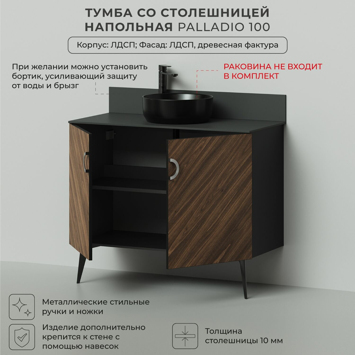 Коллекция Palladio - великолепное звучание современной классики. Изящные пропорции и нестандартный подход к дизайну с сохранением функциональности. Тумба со столешницей выполнена из ЛДСП в модных деревянных декорах. Технология производства позволила сделать элементы мебели устойчивыми к влаге. Качественная фурнитура с доводчиками обеспечивает легкое открывание и плавное закрывание дверей. Дизайнерские металлические ручки с покрытием - не только декоративный элемент, но и удобное решение - фасады остаются чистыми при постоянном открывании и закрывании. Вырез под сифон универсальный, для любого типа. Благодаря своей конструкции тумба обеспечивает удобный доступ к раковине и позволяет скрыть коммуникации. Тумба со столешницей в ванную оснащена удобным шкафчиком для хранения, что позволяет разместить всё необходимое под рукой. Для точного выбора тумбочки со столешницей в ванную комнату рекомендуем обратиться к схеме замеров, которая находится на фото в карточке товара, размеры изделия могут отличаться +/-1 см в связи со спецификой производства.