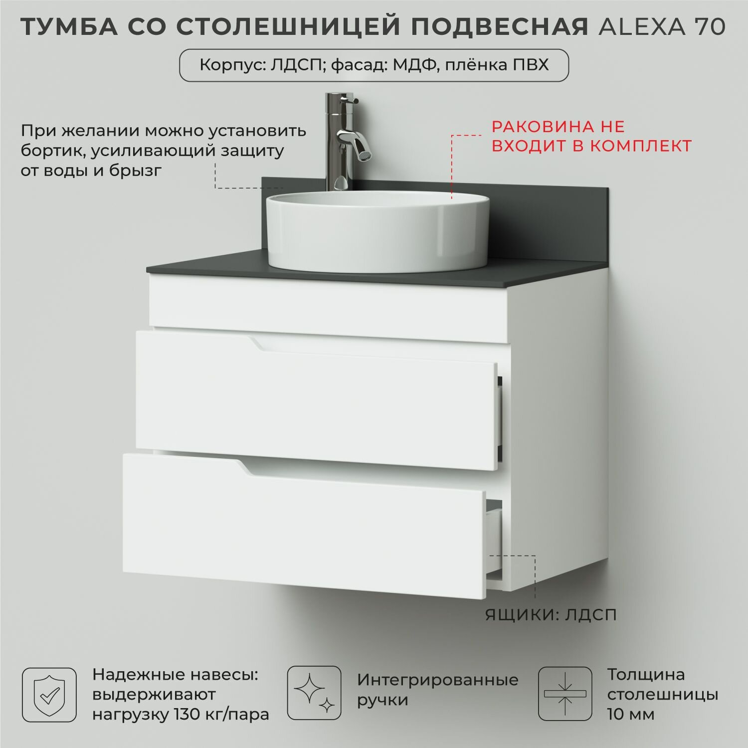 Подвесная тумба со столешницей из коллекции Alexa - это сочетание современной стилистики и богатого функционала. Подвесной способ установки дает возможность не только визуально увеличить пространство, но и обеспечивает быстрый и удобный доступ для уборки. Тумба для ванной комнаты покрыта ПВХ-пленкой, что обеспечивает изделию привлекательный внешний вид, а также износостойкость и долговечность. Качественная фурнитура с доводчиками обеспечивает легкое открывание и плавное закрывание ящиков. Вырез под сифон универсальный, для любого типа. Благодаря своей конструкции тумба обеспечивает удобный доступ к раковине и позволяет скрыть коммуникации. Тумба со столешницей в ванную оснащена удобными ящиками для хранения, что позволяет разместить всё необходимое под рукой. Ручки интегрированы в фасад , что исключает возможность случайного удара о фурнитуру. Для точного выбора тумбочки со столешницей в ванную комнату рекомендуем обратиться к схеме замеров, которая находится в карточке товара, размеры изделия могут отличаться +/-1 см в связи со спецификой производства. Дополнить комплект вы можете настольной раковиной Ceramica Nova Element и изделиями из коллекции Alexa.