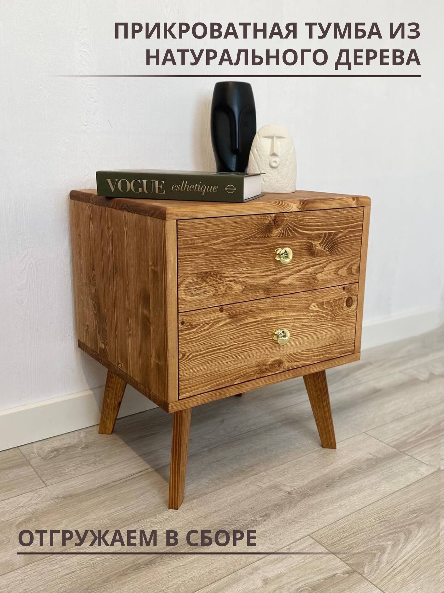 Короб прикроватной тумбы поставляется в собранном виде, Вам останется установить только ножки и ручку.