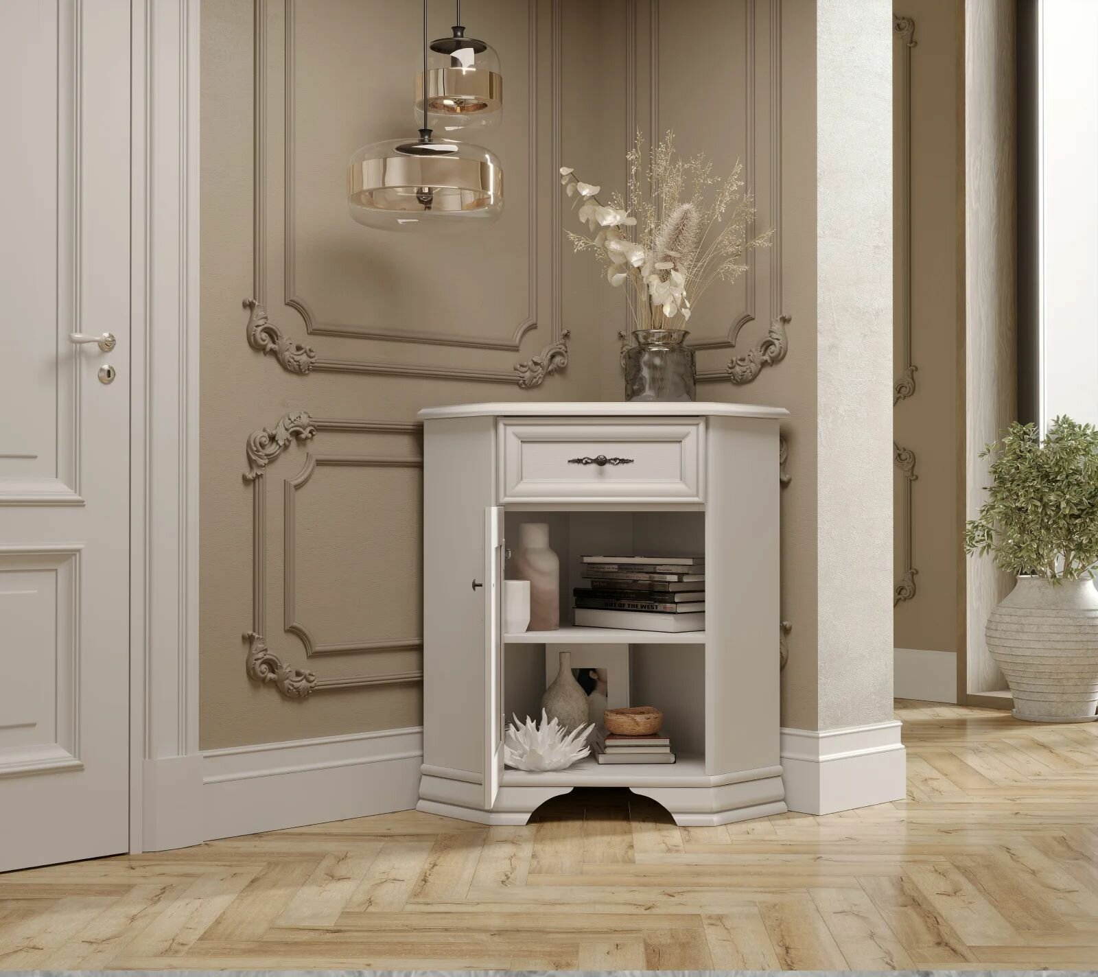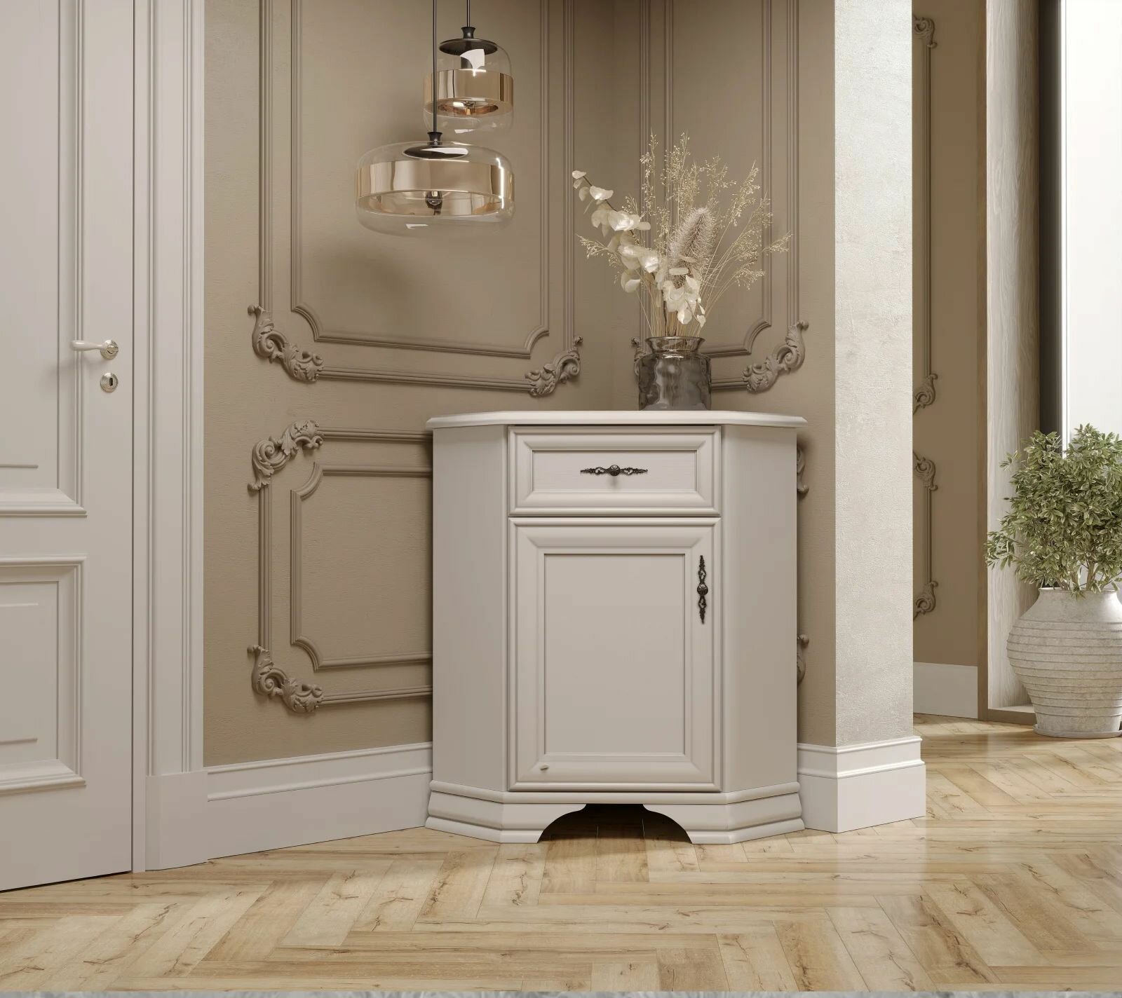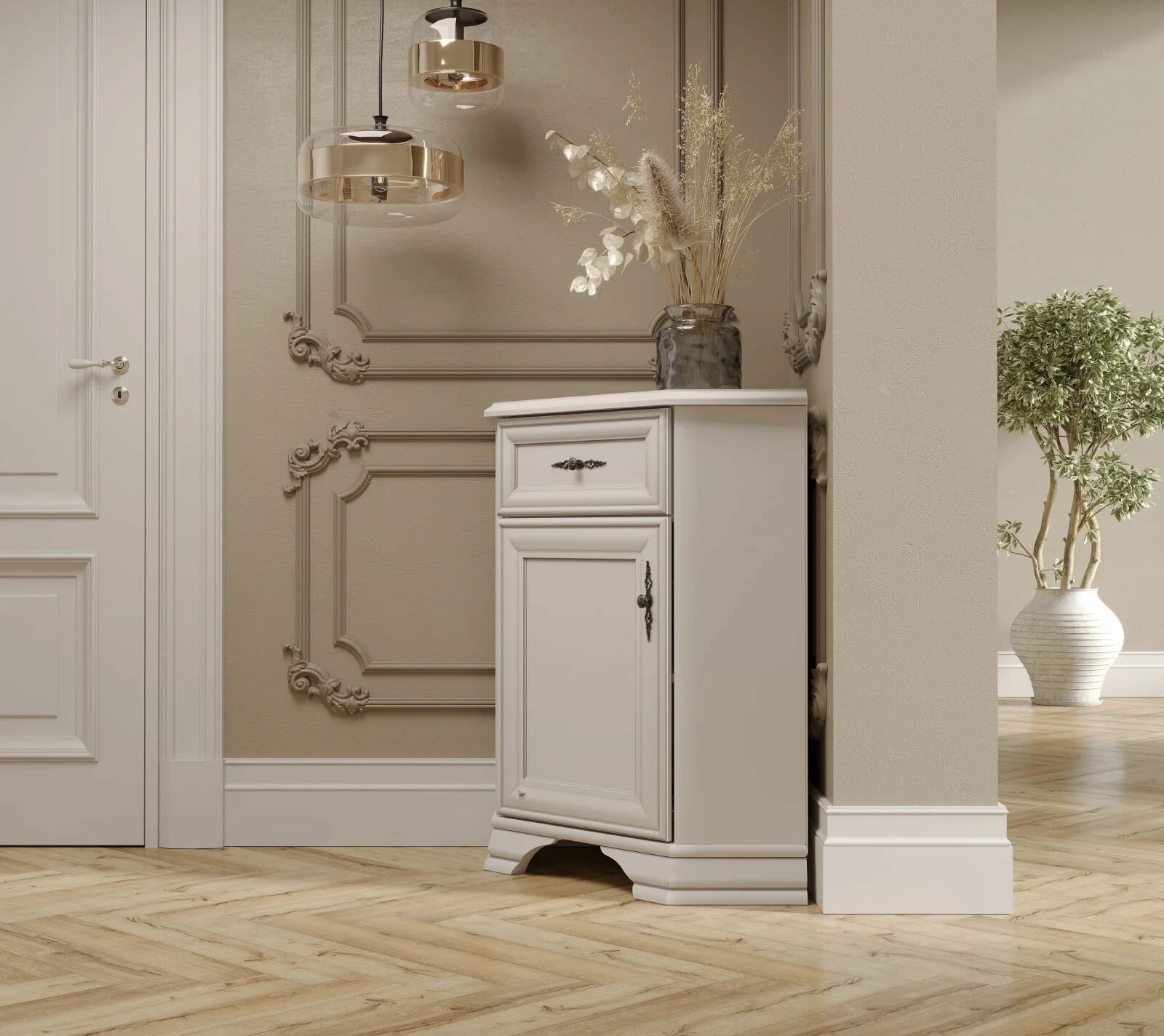 Поставить во главу угла тумбу в классическом стиле — отличное решение для компактной организации пространства. Подойдет данная модель для спальни, прихожей, детской и любого другого помещения.