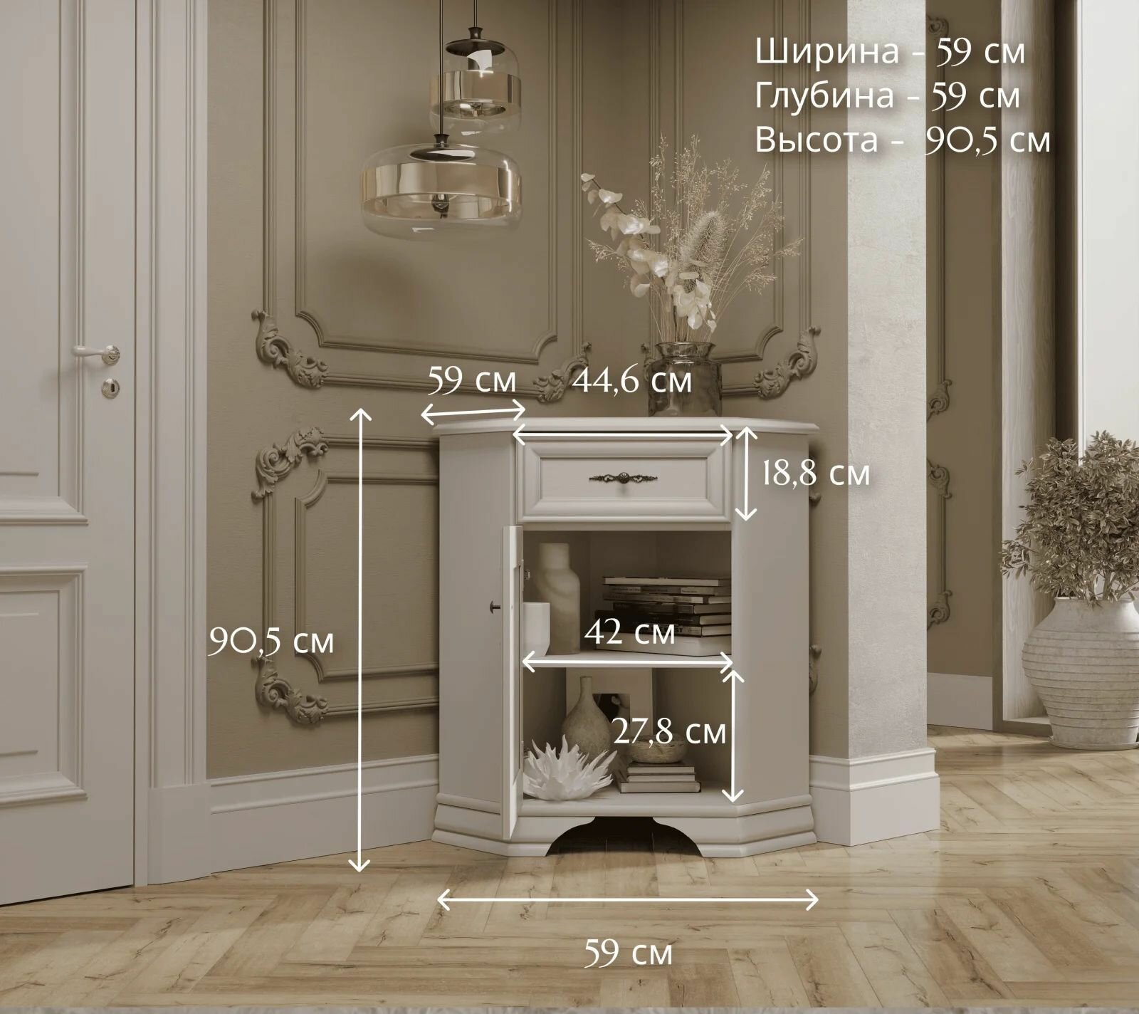 Распашная дверь, съемная полка внутри глубокой (59 см) ниши, выдвижной ящик для мелочей — все необходимые элементы для удобного хранения вещей в каком угодно углу.