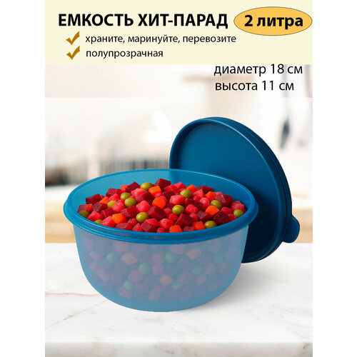 Герметичная крышка емкости «Хит-парад» на 2 литра голубой надолго сохраняет свежесть продуктов, не позволяет содержимому разливаться, удерживает запахи внутри.