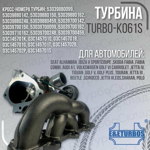 кросс-номера турбин: 53039880099, 53039880142, 53039880150, 53039880162, 53039880248, 53039880459, 53039700142, 53039700150, 53039700099, 53039700162, 53039710162, 53039700248, 53039700459, 03C145701K, 03C145701Q, 03C145701B, 03C145701G, 03C145701T, 03C145702B, 03C145702P, 03C145701S