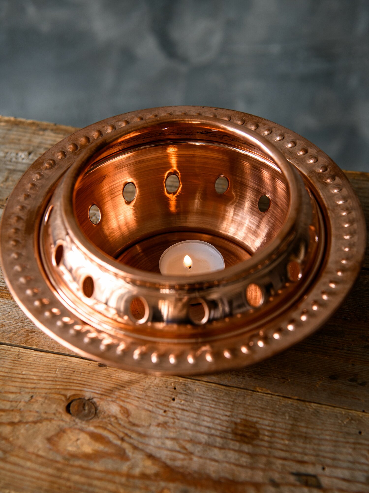 Винтажный стиль и оформление свечного подогревателя из меди порадуют своей минималистичностью и практичностью. Верхний диаметр кольца 12 см позволяет использовать подставку для чайников с бамбуковой крышкой или турецких двухэтажных чайников Чайданлык.