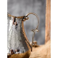 Медный кувшин, обработанный, оловом имеет серебристый цвет. Предназначен для настаивания воды, выполненный из аюрведической меди по запатентованной, бесшовной технологии. Ручная работа. Медь – важнейший элемент, она участвует во многих физиологических процессах и помогает исцелению от многих недугов. Аюрведа рекомендует настаивать воду в медном кувшине в течение всей ночи и пить ее первым делом утром натощак для поддержания здоровья. С давних времен Турция славится производством посуды и изделий из меди. Медная посуда является неотъемлемой частью индийской истории, и присутствует во всех семьях. Полезные свойства медного кувшина:- медь убивает микробы, и может использоваться для микробиологической очистки питьевой воды- медь имеет свойства, стимулирующие перистальтику кишечника, убивает вредные бактерии и уменьшает воспалительные процессы, благодаря чему является прекрасным средством от язвы, несварения и инфекций. Медь насыщает обычную воду ионами, которые помогают поддерживать кислотно-щелочной баланс организма (рН). На фото может казаться золотистым на самом деле белый!