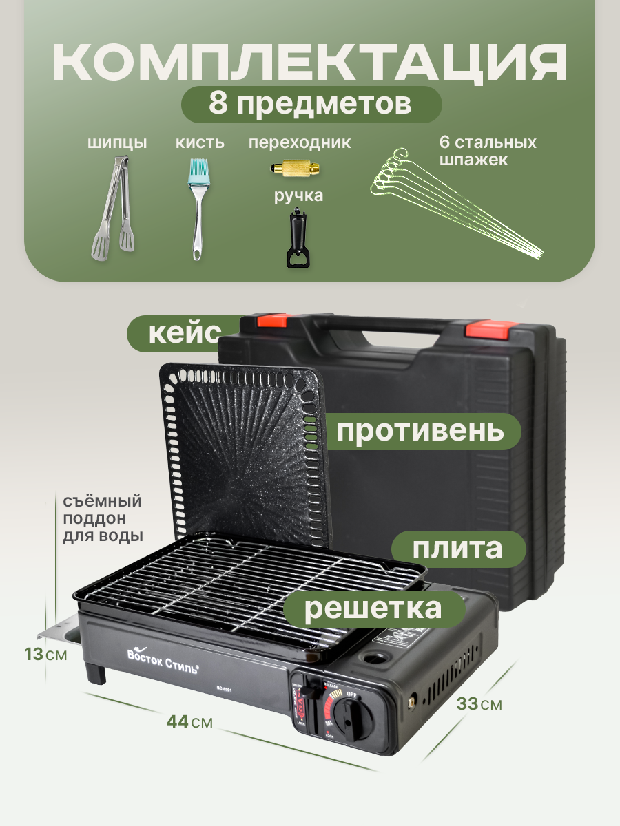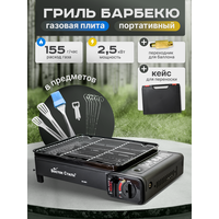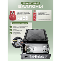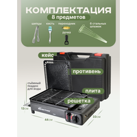 Газовая горелка туристическая, газовый гриль-барбекю из стали , с переходником под бытовой газовый баллон позволяющим использовать малые и большие баллончики , оснащена пьезоподжигом и переносится в прочном пластиковом кейсе . Определенно должен входить в набор для выживания и туризма. Прекрасно подойдет при выезде при рыбалки летней или зимней, охоте. Поверхность плитки имеет решетку гриля и противень . Вам нет необходимости носить спички, зажигалки, так как плита оборудована пьезоподжигом. Отсек для сбора жира легко вынимается с боку. Походная горелка работает от баллон от 220гр, газ бутан, также в комплекте идет складной пластиковый кейс, чемоданчик. Данная походная газовая плита является незаменимым помощником не только в длительных туристических походах , но и на дачах , в садах , в непродолжительных походах за грибами , на охоте и на рыбалке . Данная газовая горелка на баллончик - это вес менее полутора килограмма , небольшие габариты , мощность от двух киловатт . Альтернатива электрическим индукционным плитам, духовкам. Не занимает много места в вашем инвентаре. Мужской подарок, прекрасный помощник девушке. У походной кухни широкий спектр применения. Подходит для разогрева чайника, готовки в казане или котелок, при покупке насадки, можно использовать как обогреватель печка в палатку, для углей. Наша настольная плитка не займет много места в рюкзаке, вместе с вашими охотничьими принадлежностями. Газовая горелка туристическая - преимущества: Безопасность для здоровья: газ не выдает копоти и сгорает без запаха . Качественное топливо: горелка практически не засоряется никакими посторонними примесями, поэтому нет необходимости в сложном техническом обслуживании . Простота и надежность конструкции: предварительный прогрев не является обязательным , горелка очень легкая и в плане веса , и в плане эксплуатации. Все что требуется - это закрепить баллон в горелку, открыть клапан и поджечь газ. С пьезоподжигом настольная горелка плита газ станет незаменимым помощником.