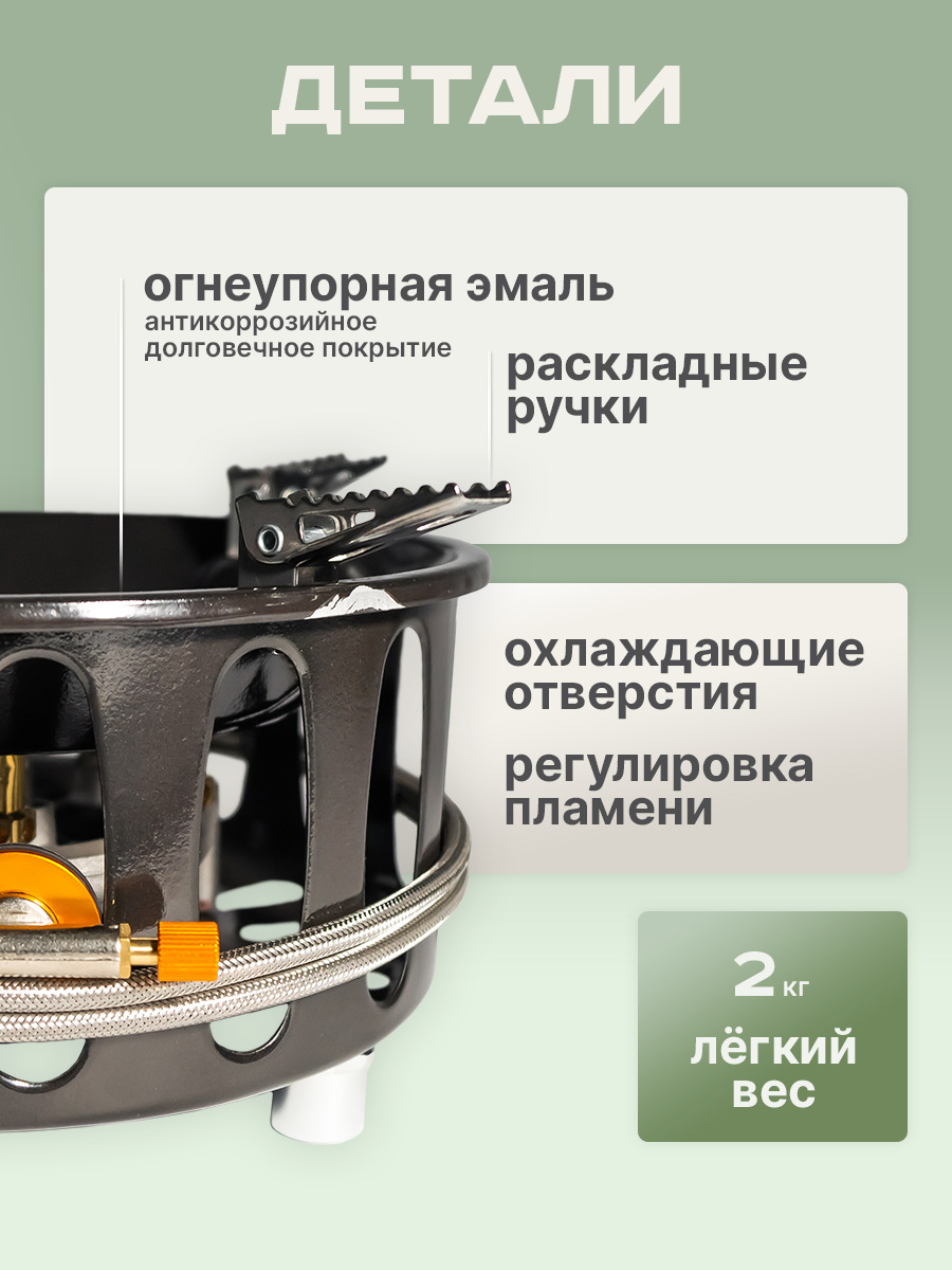 Мощная, устойчивая и компактная туристическая газовая плита идеально подходит для приготовления блюд в казане, воке или на сковороде. Конструкция рассчитана на интенсивное использование на открытом воздухе: походы, пикники, кемпинг, рыбалка и дача.