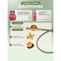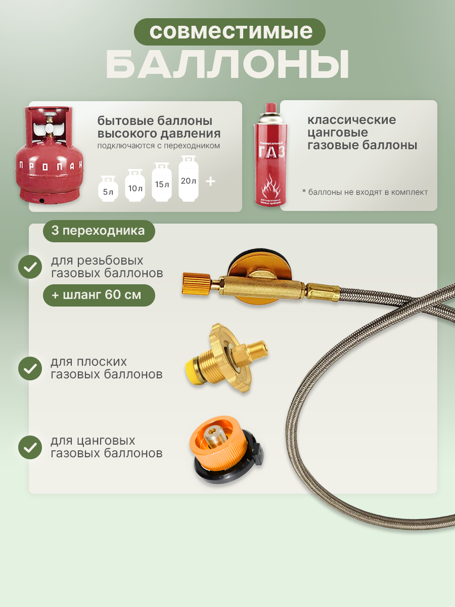 Работает от стандартного газового баллона (резьбового или с переходником)