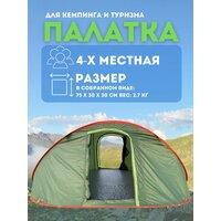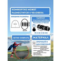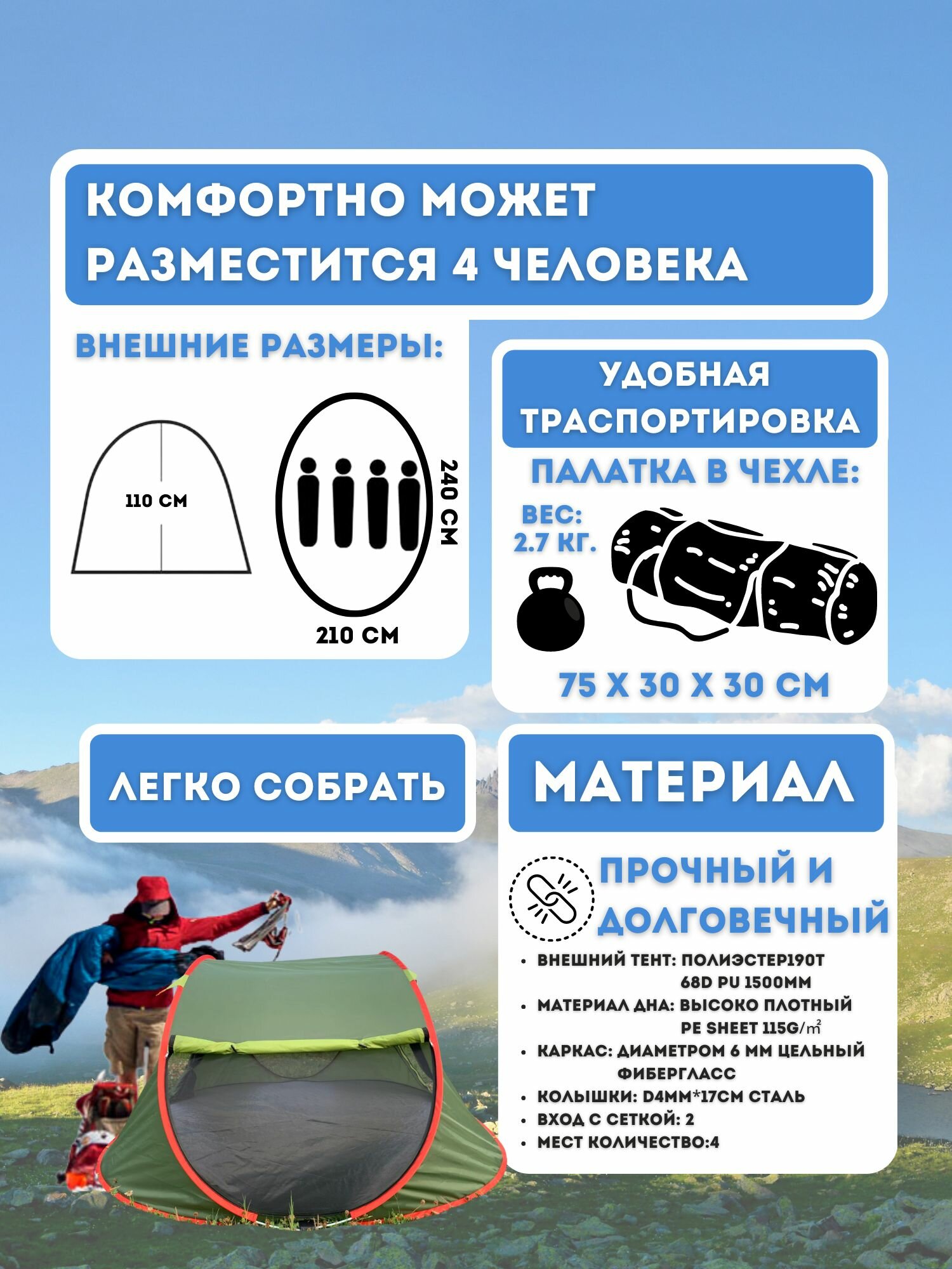 Палатка туристическая автоматическая, четырехместная, однослойная - прекрасный бюджетный вариант для похода и отдыха на природе. Палатка автомат раскладывается и собирается в одиночку за 1 минуту. С этим легко справится и хрупкая девушка, и подросток. Габариты установленной платки 235х210х110 см. Размер пола палатки по внутреннему периметру 235х210 Окно в палатке напротив входа, что дает хорошее проветривание в жару. Москитная сетка (на молнии) есть и на окне, и на входе. Палатка автомат водонепроницаемая, но защитит только от кратковременного дождя небольшой силы (рассчитывать, что палатка выдержит затяжной дождь, как и, любая однослойная, не стоит). Дно палатки сделано из непромокаемого материала усиленной прочности. Автоматическая палатка легкая, компактно упакована в сумку-чехол, ее удобно взять и в пеший поход, и положить в машину.