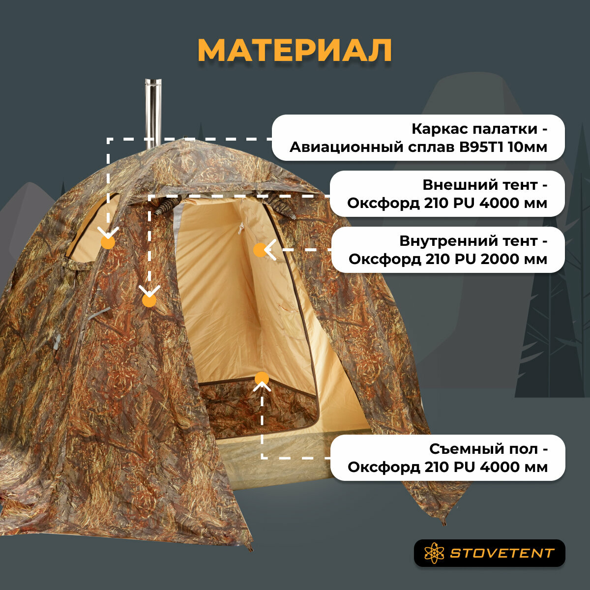 В оснащении: москитные сетки, пол на молнии, вывод для трубы дымохода (для отопительного прибора).