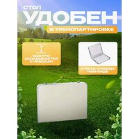 Особенностью данного стола является его складная конструкция. Телескопические ножки убираются внутрь столешницы, что обеспечивает компактность и удобство хранения. Регулировка высоты позволяет адаптировать стол под различные условия использования.