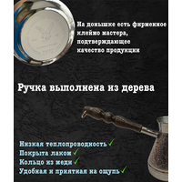 Турка для кофе медная 380 миллилитров, придется по вкусу любому ценителю кофе. Снаружи джезвы есть орнамент, изображающий большие грозди спелого винограда, который прячется среди лозы и листьев. Толстые стенки медной турки (0,8 мм.) «Виноград» равномерно прогревают кофе, раскрывая богатство его вкуса и аромата. Корпус турки медный, снаружи защитно-декоративное покрытие черный никель. Вы почувствуете, как каждый глоток этого напитка становится настоящим удовольствием, подчеркнутым теплом меди и неповторимым дизайном турки. Чтобы избежать проблем с обжигающей ручкой, эта часть была изготовлена из дерева. На донышке имеется клеймо мастера, подтверждающее качество продукции ИП Кулешов А. Г. Турка упакована в прозрачный пакет и коробку, которые предотвращают царапины при транспортировке посылки. Каждый сантиметр в этой турке выполнен с любовью и вниманием к деталям, что делает его превосходным выбором для ценителей кофе. Мы работаем более 20 лет, наша продукция имеет сертификат соответствия качества.