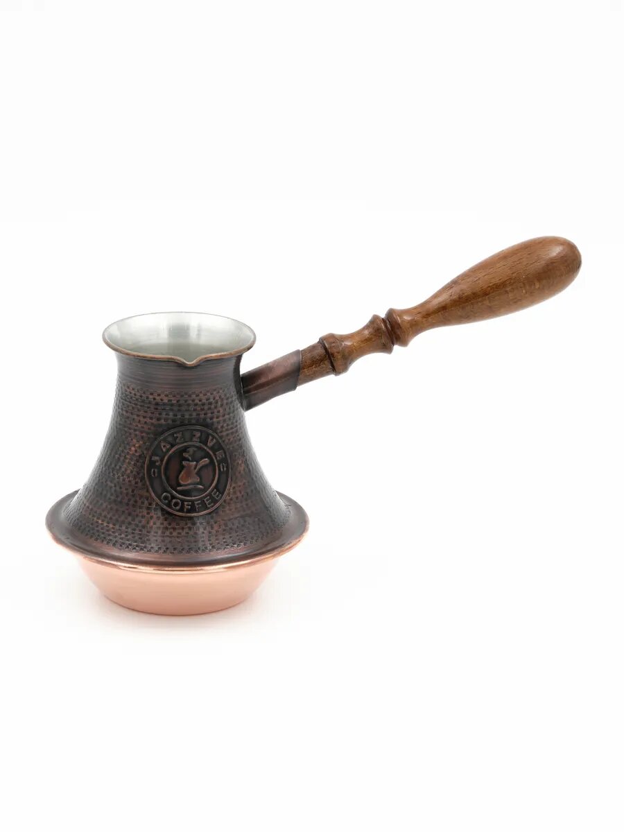 Особенная турка с двойным дном, пространство между которыми заполнено песком. Изделие выполнено из меди, которая быстро и равномерно нагревается, а песок в нижней части накапливает и равномерно распределяет тепло по дну турки, имитируя приготовление кофе на песке.