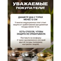Информация для владельцев индукционных плит Диаметр дна у данной турки менее 12 см. У многих индукционных плит стоит защита от срабатывания при диаметре посуды менее 12 см. Вы можете «обмануть» плиту, поставив одновременно две турки, либо поставив на эту конфорку край другой индукционной посуды (например кастрюли с водой). Также вы всегда можете вернуть данную турку в стандартные сроки возврата.