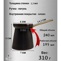 Соотношение горлышка и дна, создаёт правильное давление внутри. Джезва вытянута из одной медной пластины толщиной 1.5 мм, что обеспечивает равномерность заваривания. Благодаря низкой теплопроводности латуни и длине, ручка не обжигает руки.