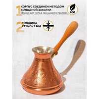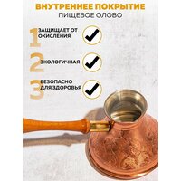 Чтобы приготовить бодрящий напиток по всем правилам, нужна хорошая турка для кофе. Выбирая такую, необходимо учесть все важные параметры: материал, форму, объем, диаметр дна и горлышка. Самые надежные и качественные турки изготавливают из меди. У нее отличная теплопроводность, вода нагревается равномерно по всему объему, и каждая частица помола отдает свой потенциал. Именно поэтому наши кофеварки изготавливаются из меди. При изготовлении корпуса мы соблюдаем правильную форму турки. Золотое правило приготовления кофе по-турецки гласит: диаметр горлышка джезвы должен быть в два раза меньше диаметра дна. У этого правила есть понятное объяснение – зауженное горлышко не позволяет ценным эфирным маслам улетучиться из сосуда. При идеальном приготовлении в районе горлышка образуется пенка, играющая роль своеобразной пробки, препятствующей контакту с воздухом. При правильной разнице дна и горлышка стенки будут наклонными. Наклон способствует опусканию кофейной гущи на дно, что улучшает вкус напитка. Но при всех достоинствах медной посуды, ей свойственно окисляться, поэтому внутреннею часть джезвы мы покрываем защитным покрытием состоящие из двухлористого пищевого олово толщиной в 40 мкм, это покрытие надежное, безопасное для вашего здоровья и не искажает вкус готового напитка. Восточная джезва устойчива к высоким температурам – не плавится на газовой, электрической плите, даже если отвлечься и забыть о приготовлении. Деревянная ручка выполнена из кавказского бука.
