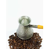 Объем 440 мл. Турка изготовлена из высококачественной меди, внешняя поверхность покрыта декоративным черным никелем, внутренняя поверхность – слоем пищевого олова, являющимся безопасным для здоровья. Медь обладает равномерной теплопроводностью, что позволяет приготовить кофе, отличающийся изысканным ароматом. Узкое горлышко также является положительной характеристикой изделия. Длинная ручка, выполненная из дерева, обеспечивает защиту от ожогов. Подходит для использования на всех типах плит, кроме индукционных. Производитель: Россия.