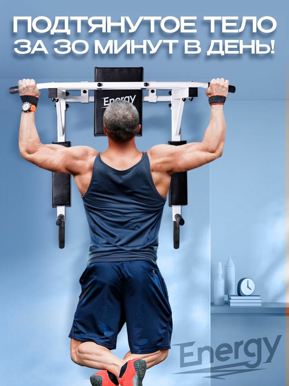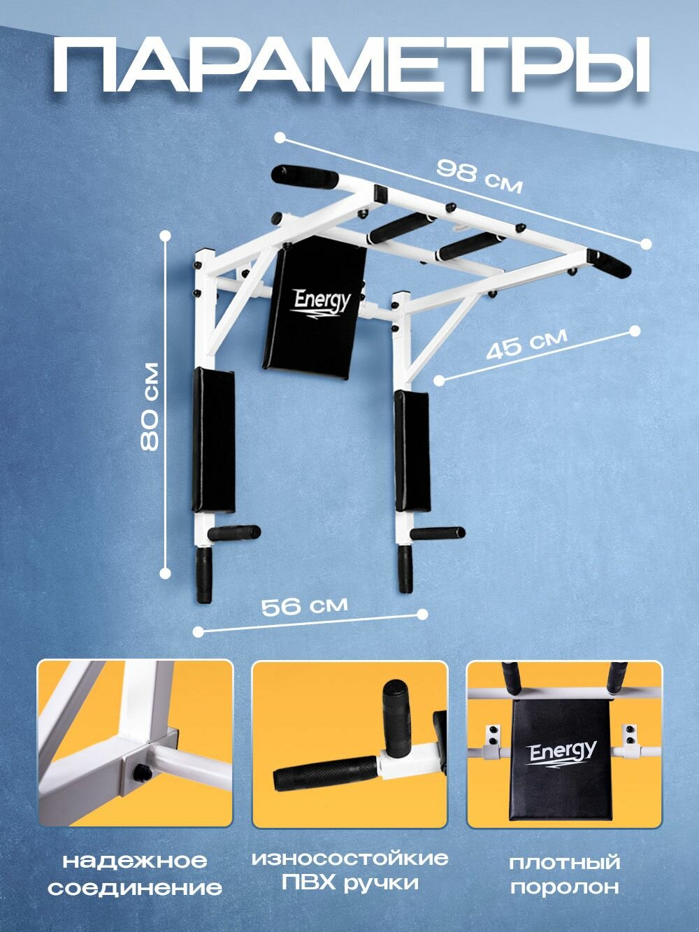 Турник брусья 3в1 "Energy" – идеальный инвентарь для тренировок в домашних условиях. Этот многофункциональный тренажер сочетает в себе функции турника, брусьев и скамьи для пресса, что делает его отличным выбором для создания фитнес уголка прямо у вас дома.