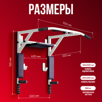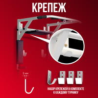 Турник изготовлен в России и имеет максимальную нагрузку до 250 кг. Он оснащен 8 хватами и комплектуется подлокотниками, крепежом, рукоятками, ручками мягкими, болтами, подспинником, перекладиной, трубой с плашкой, Г-образным профилем, саморезами, кронштейном, заглушками, трубой поперечной и гайками.