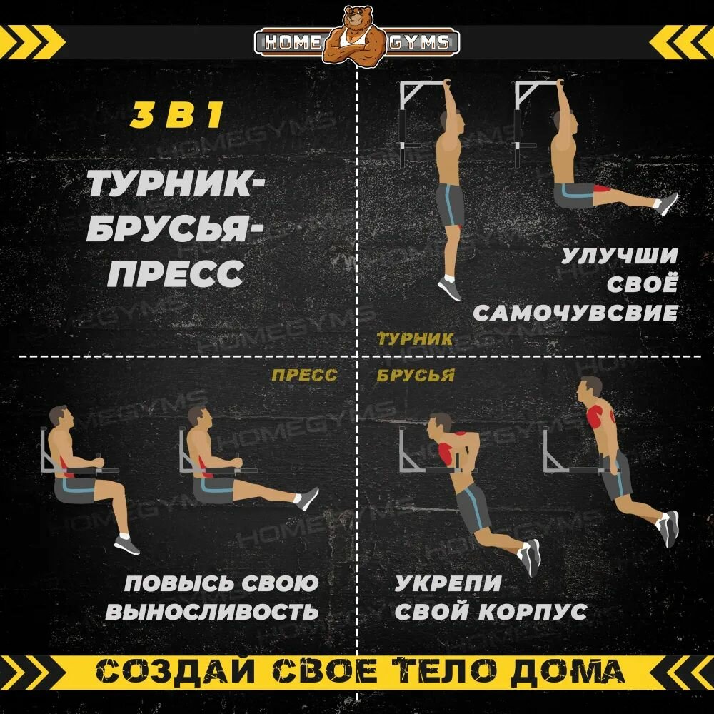 Турник брусья пресс 3 в 1 позволяет заниматься взрослым и детям, выполняя разные спортивные упражнения на все основные группы мышц: