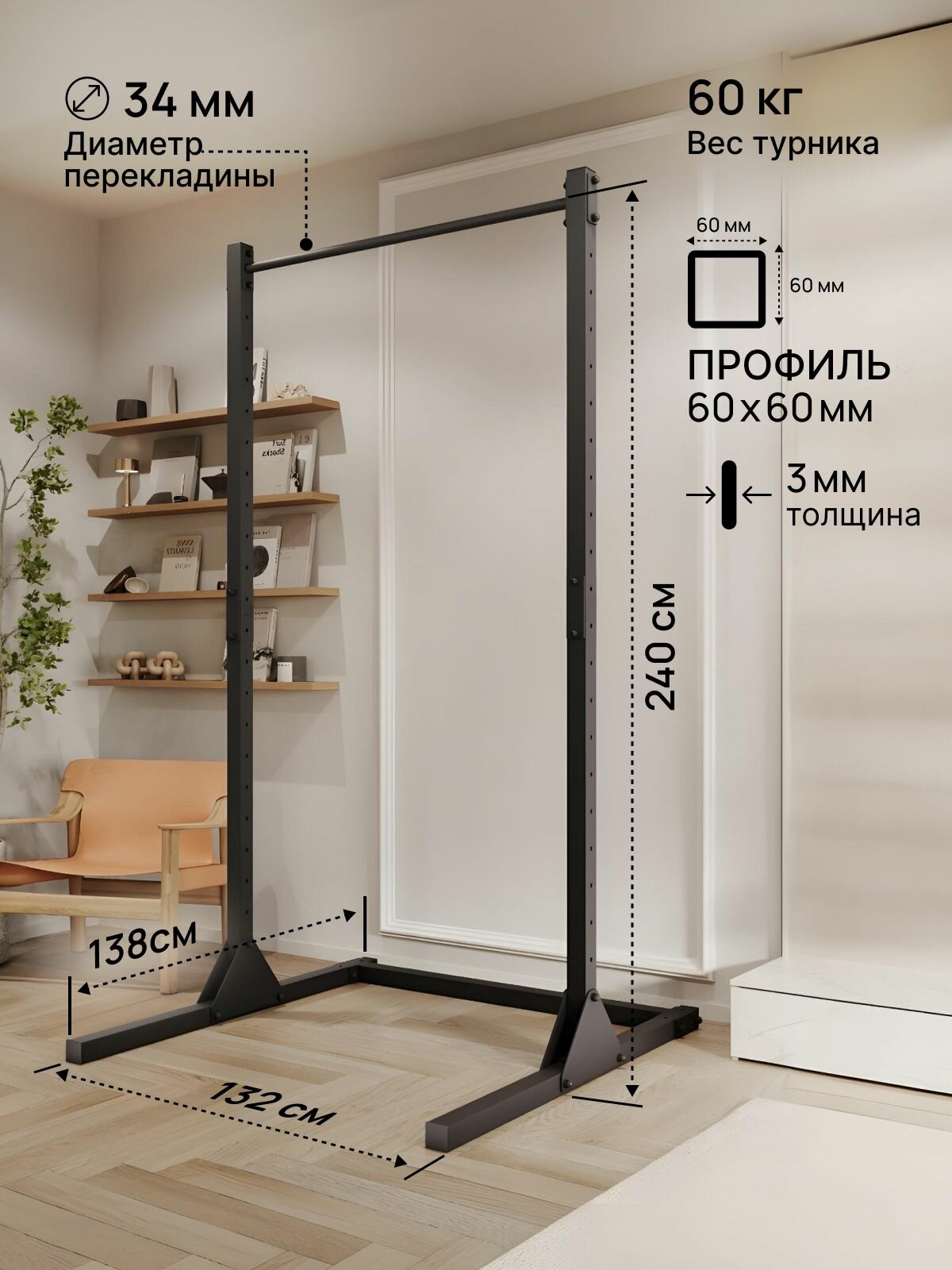 - Каркас из прочного и массивного профиля выдерживает динамические тренировки, упражнения с подвесным оборудованием и дополнительным весом.