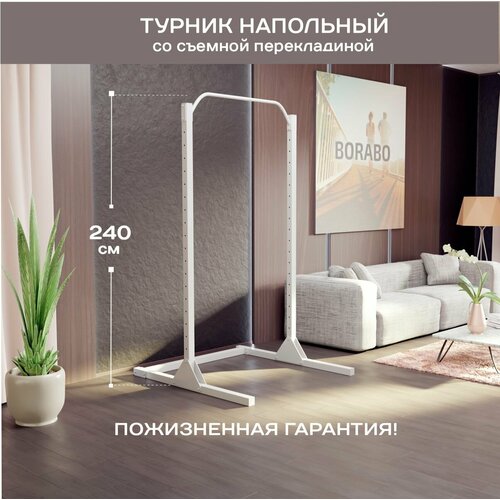 Съёмная высокая перекладина — дополнительный аксессуар к напольной силовой стойке-турнику BORABO. Изогнута по краям. Это позволяет нагружать весь мышечный массив верхней части тела: грудные мышцы, широчайшие мышцы спины, брюшной пресс и трицепсы. Крепится к стойке на стальные пластины и болтовые соединения, необходимые болты входят в комплект.