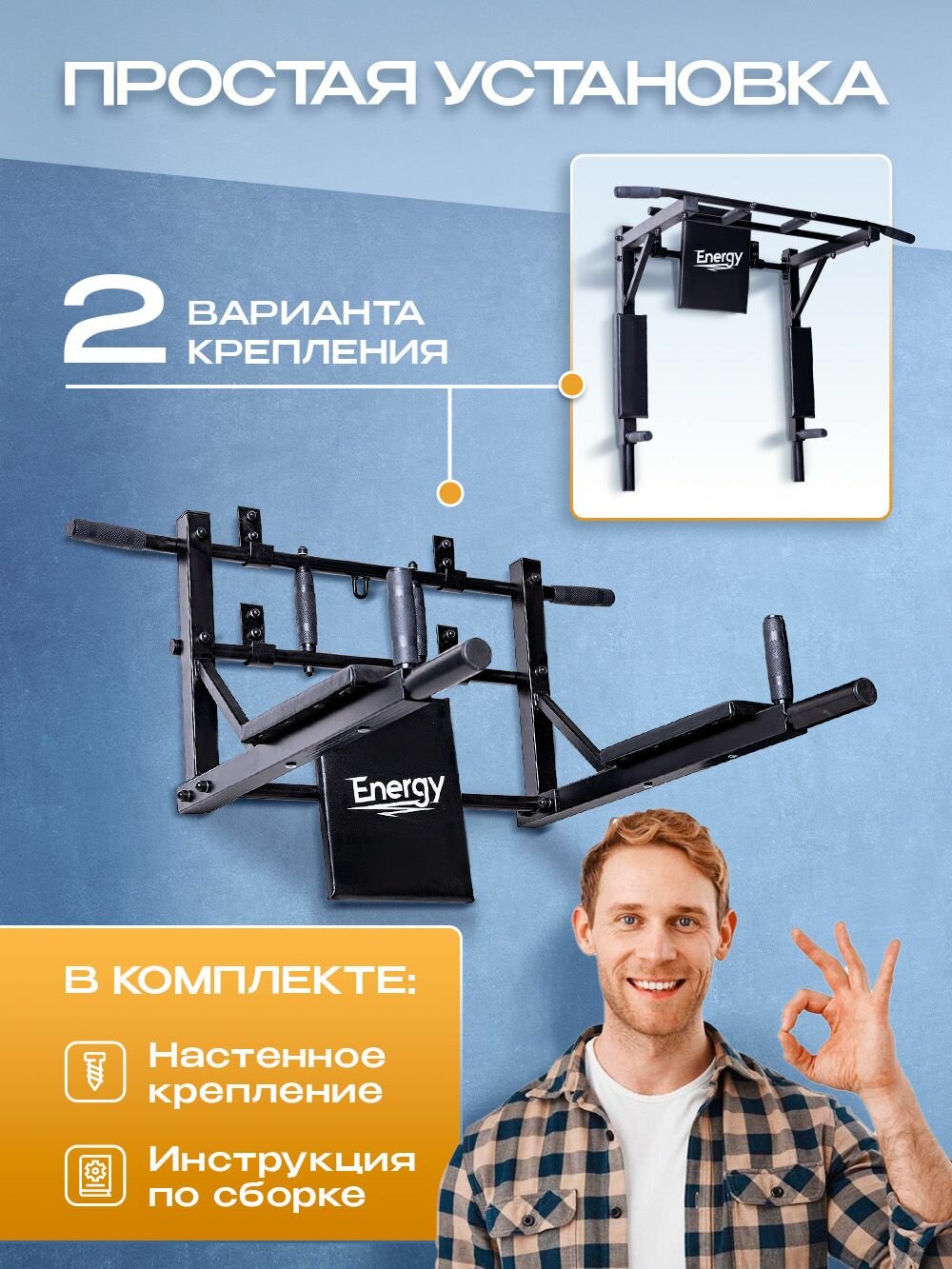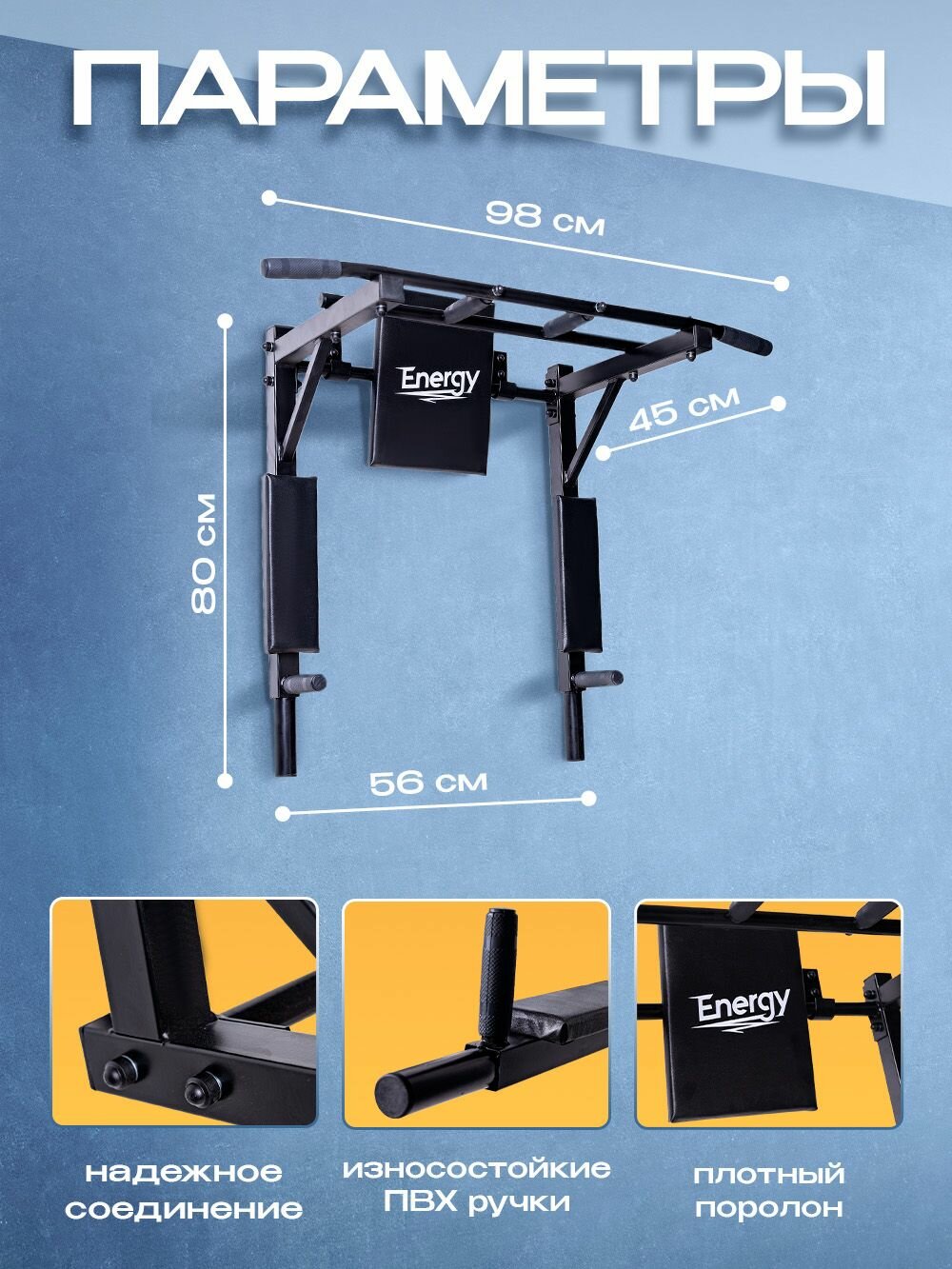 Турник брусья 3в1 "Energy" – идеальный инвентарь для тренировок в домашних условиях. Этот многофункциональный тренажер сочетает в себе функции турника, брусьев и скамьи для пресса, что делает его отличным выбором для создания фитнес уголка прямо у вас дома.